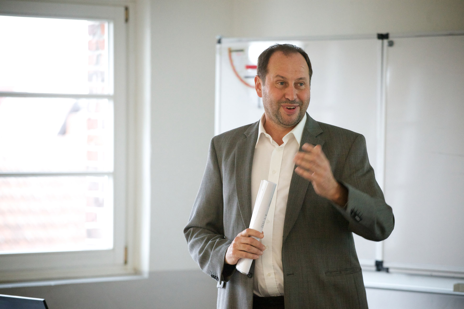 Der Dekan Professor Lothar Budde hatte zu dem Treffen eingeladen, um den Austausch untereinander anzuregen: „Mir ist die Integration des Studienorts in den Fachbereich sehr wichtig, ich möchte das Wir-Gefühl stärken. Gütersloh ist kein Satellit, im Gegenteil: Der Studienort gehört ganz selbstverständlich zu unserem Portfolio mit der Spezialität eines besonderen Studienkonzeptes, dem praxisintegrierten Studium.“ Die Zusammenarbeit wird seit Einführung der Studiengänge im August 2010 gelebt: Viele Professorinnen und Professoren aus Bielefeld lehren in Gütersloh und die Studierenden nutzen einige Labore an den Bielefelder Standorten. Professor Dr. Thomas Kordisch hat den Studienbetrieb in Gütersloh als Projektleiter vor Ort aufgebaut: „Ich bedanke mich ganz herzlich bei allen Bielefelder Kolleginnen und Kollegen, die mich und das Team Gütersloh von Anfang an unterstützt haben. Sei es in der Lehre oder bei organisartorischen Fragen.“