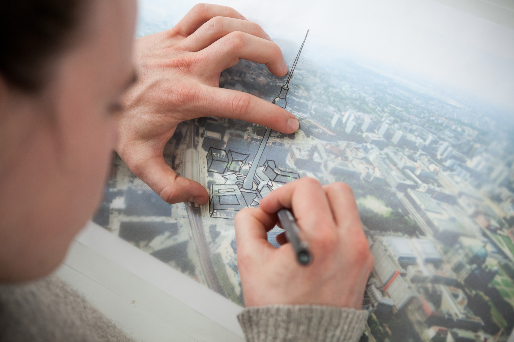 Die 21 Studentinnen und Studenten der Partnerhochschulen "Mimar Sinan Fine Arts University in Istanbul" und der "Hogeschool van Amsterdam" verbrachten zunächst eine Woche in Berlin. Zusammen mit 20 Architekturstudentinnen und -studenten aus Minden sowie Professorinnen und Professoren der drei Hochschulen erkundeten sie den ursprünglichen Kern Berlins: Das heutige Rathausforum zwischen Alexanderplatz und Schloßplatz. Der Standort ist von internationalem Interesse, weil er einen Schnittpunkt in der deutschen Geschichte von Ost und West darstellt. 2017 soll das jetzt unbebaute Gebiet erschlossen werden. Doch wie?