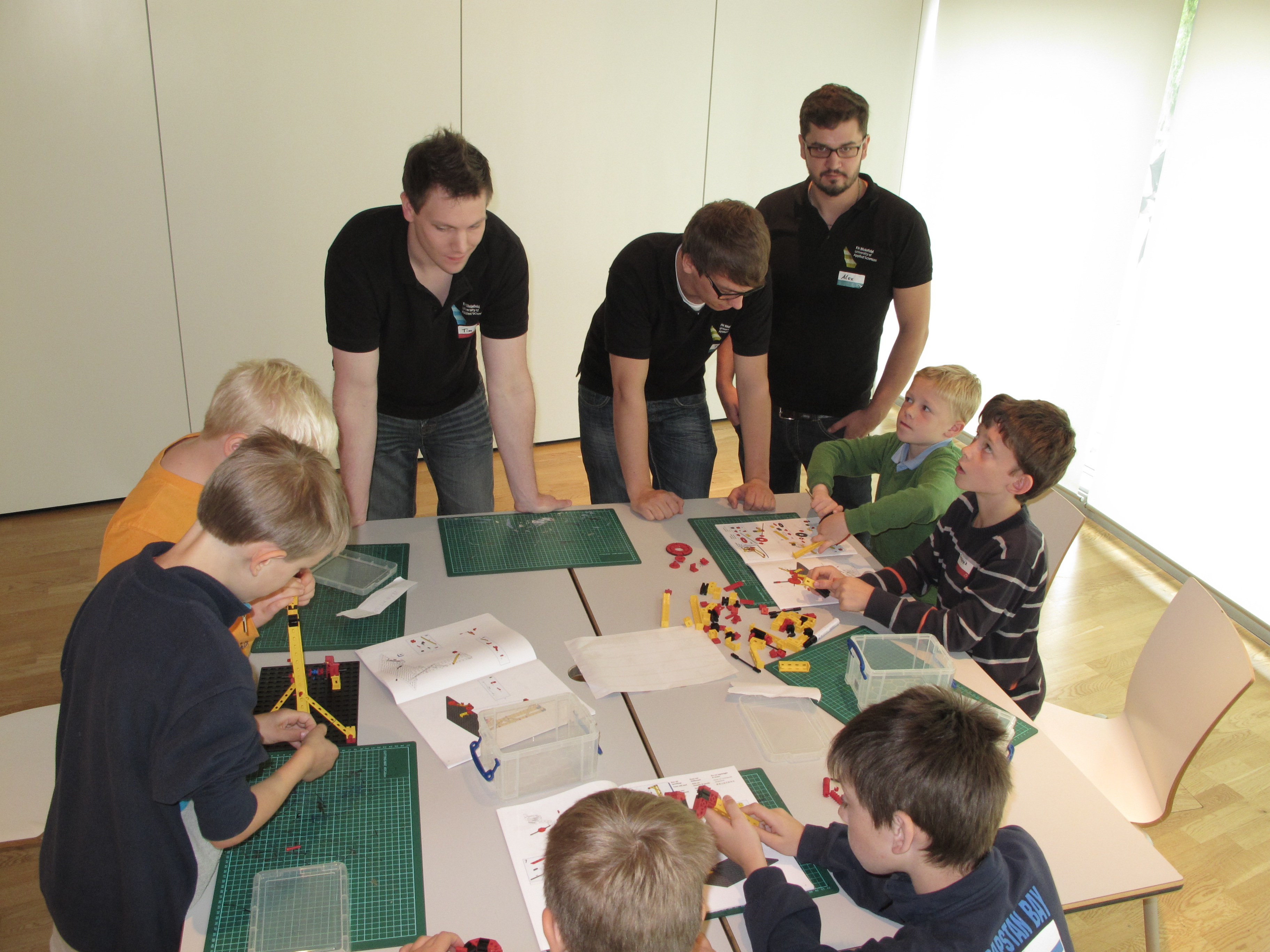 Am folgenden Tag standen drei Workshops des zdi Schülerinnen- und Schülerlabors experiMINT der FH Bielefeld auf dem Plan. Die Mitarbeiter Tim Albrecht, Alexander Hill und Tobias Ehlentrup arbeiteten mit etwa 60 Kindern im Alter zwischen 8 und 14 Jahren zum Thema mechanische Geräte und Maschinen Leonardos. Die kleinen Nachwuchswissenschaftler setzten mit den laboreigenen Technik-Baukästen Ideenskizzen von Leonardo in Funktionsmodelle um. Als Andenken bekam jedes Kind zudem einen Bausatz der Schnellbaubrücke Leonardos geschenkt.