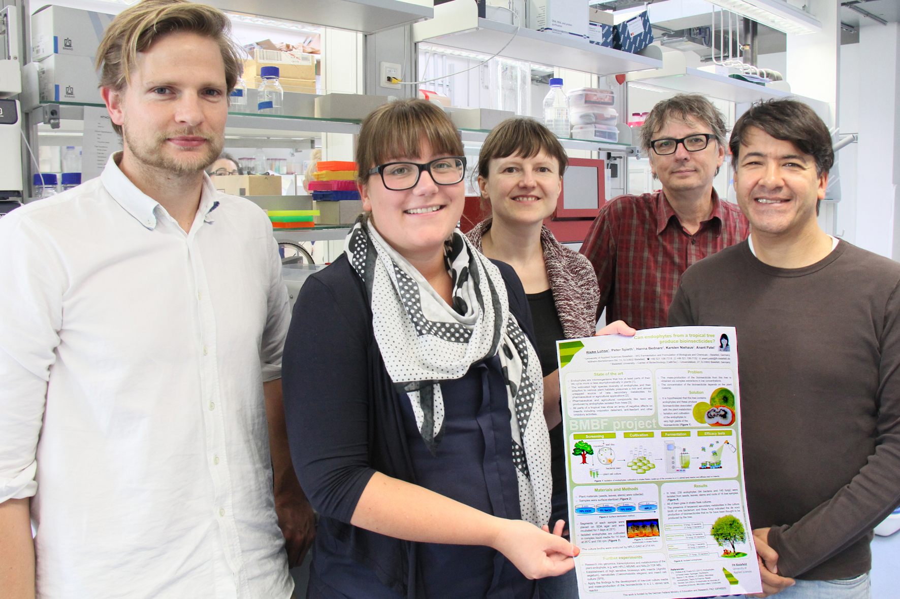 Auf ihrem Poster präsentiert Rieke Lohse erste Ergebnisse des Projekts zur Produktion eines Bioinsektizides mittels Mikroorganismen, so genannter Endophyten, aus dem Inneren eines tropischen Baumes. In der Natur produziert dieser spezielle Baum Stoffe, die für Insekten fraß- und reproduktionshemmend wirken und somit ein natürliches Bioinsektizid darstellen. Die Forscher gehen nun der Frage nach, ob die in dem Baum lebenden Endophyten für die Bioinsektizid-Produktion verantwortlich sind. Im Rahmen des Projektes wurden zunächst zahlreiche Endophyten, also Bakterien und Pilze, aus Samen, Ästen, Rinde, Blättern und Wurzeln isoliert. Anschließend wurden sie im Labormaßstab kultiviert und in Zusammenarbeit mit dem Kooperationspartner der Universität Bielefeld, Prof. Dr. Karsten Niehaus von der Arbeitsgruppe »Proteom- und Metabolomforschung«, mittels komplexer Analyseverfahren auf ihre Bioinsektizid-Produktion hin untersucht. Im weiteren Verlauf des Projektes, das vom Bundesministerium für Bildung und Forschung gefördert wird, soll in Kooperation mit einem Unternehmen die Bioinsektizid-Produktion im Labormaßstab optimiert werden, so dass zum Projektende die Produktion möglicherweise unabhängig vom Pflanzenmaterial stattfinden kann.
