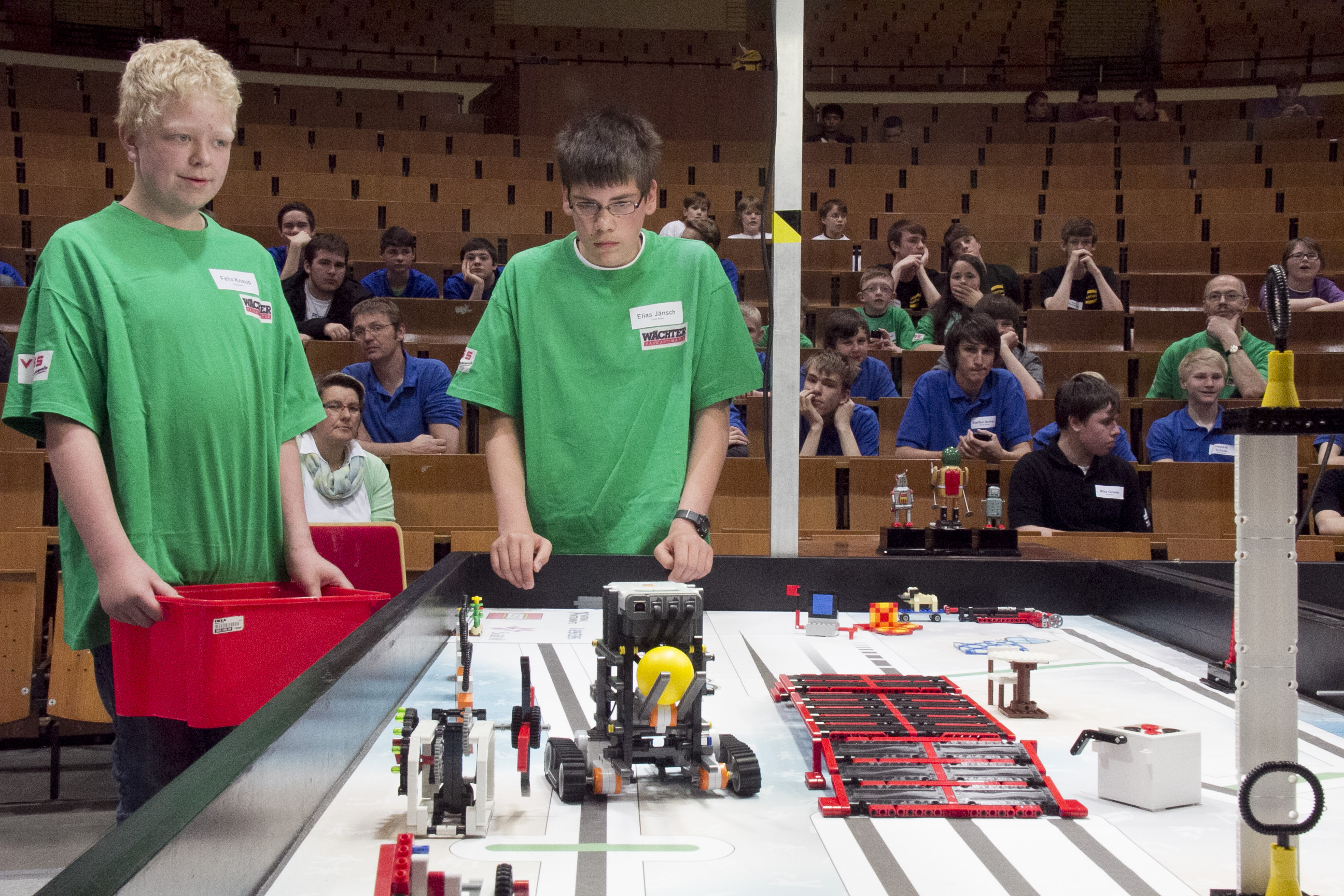 In zweieinhalb Minuten mussten die Roboter so viele seniorengerechte Aufgaben selbstständig erledigen wie möglich. So musste der Roboter etwa einen Hebel betätigen, um einen Herd auszuschalten oder mittels Farbsensor eine spezielle Medizinflasche auswählen, greifen und transportieren. Wer eingreifen musste, wurde mit Punktabzug bestraft. "Der Parcours ist wirklich schwierig, die Höchstpunktzahl von 673 Punkten ist eigentlich nicht zu erreichen. Deshalb ist das Ergebnis der 'tux' auch eine Wanhsinns-Leistung.", sagt Kerstin Helmerding vom zdi-Zentrum aus Düsseldorf. Meistens würden die Teams bis zu 250 Punkte machen.