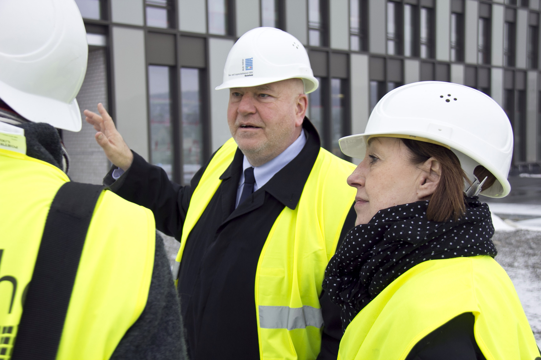 Heinrich Micus machte beim Rundgang mit der Presse über die Baustelle klar: "Sie sehen, hier wird weiter gearbeitet, und es gibt keinen Stillstand." Rund 350 Arbeiter sind zurzeit insgesamt auf der Baustelle aktiv. "Alle Firmen sind an Bord und arbeiten und leisten", so der BLB-Niederlassungsleiter. Rund 80 Prozent der Bauarbeiten seien erledigt. Der Gebäudekomplex sei, sagt Micus, "ein Unikat, und eben nicht ein beliebiges Industrieprodukt".
