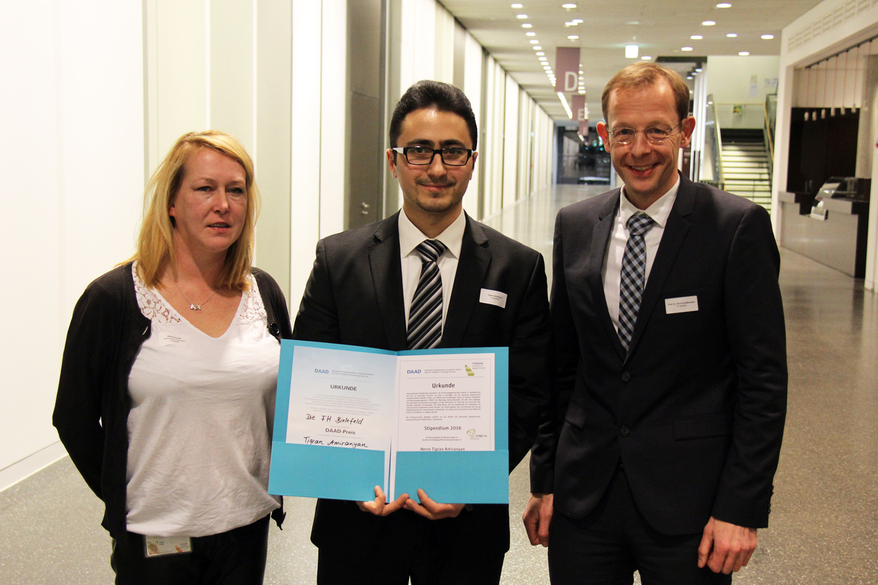 Bei der DAAD-Preisverleihung und der Vergabe der DAAD-Matching Funds-Stipendien am 8. Dezember im FH-Hauptgebäude war Tigran Amiranyan mit acht weiteren internationalen Studierenden der FH Bielefeld erfolgreich. Der DAAD-Preis „soll dazu beitragen, den großen Zahlen ausländischer Studierender an deutschen Hochschulen Gesichter zu geben und sie mit Geschichten zu verbinden. Damit wird deutlich, dass jeder einzelne ausländische Studierende ein Stück von Deutschland in seine Heimat mitnimmt und etwas von sich in Deutschland lässt - eine Bereicherung für beide Seiten“, meinte Sandra Schoeß vom Akademischen Auslandsamt anlässlich der Preisverleihung. Der Preis ist mit 1.000 Euro dotiert.