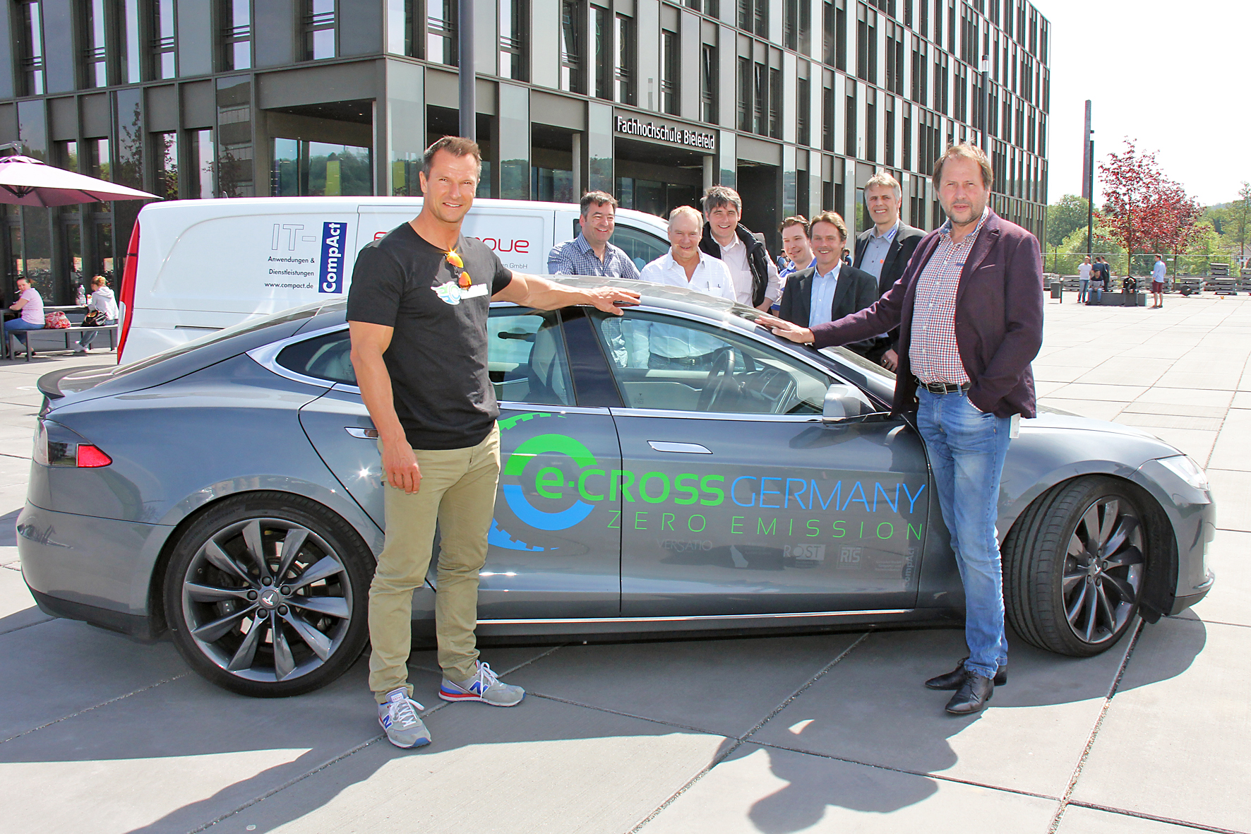 Entstanden ist die Idee im Umfeld der e-Cross Germany, einer Art Rallye mit Elektroautos durch Deutschland. „Ein Unternehmer aus Steinhagen stellte das Auto zur Verfügung und die Carsharing-Teilnehmer entschieden sich dazu, längere Geschäftsfahrten, sofern sie nicht mit dem Zug durchgeführt werden können, per Elektroauto zu absolvieren“, berichtet Jens Ohlemeyer, Tour Manager der e-Cross Germany und Vorstandsvorsitzender der KlimaWoche Bielefeld. Die beiden Vereine verwalten das Carsharing und können dafür umsonst fahren. Die anderen sechs Teilnehmer beteiligen sich je nach gefahrenen Kilometern und genutzter Zeit an den Kosten von 2.000 Euro im Monat. Fester Standpunkt des Teslas ist die Tiefgarage unter dem Hauptgebäude der Fachhochschule (FH) Bielefeld. „Bei uns wird das Auto geladen, gewartet und betreut“, berichtet Prof. Dr. Lothar Budde, Dekan des Fachbereichs Ingenieurwissenschaften und Mathematik und selbst einer der sechs Tesla-Fahrer. Neben dem exklusiven Tesla steht bereits seit 2014 ein Mercedes Benz Vito e-Cell in der FH-Tiefgarage, der ebenfalls von der KlimaWoche Bielefeld betreut wird. „Diesen kann jedes unserer Mitglieder nutzen“, erklärt Ohlemeyer.