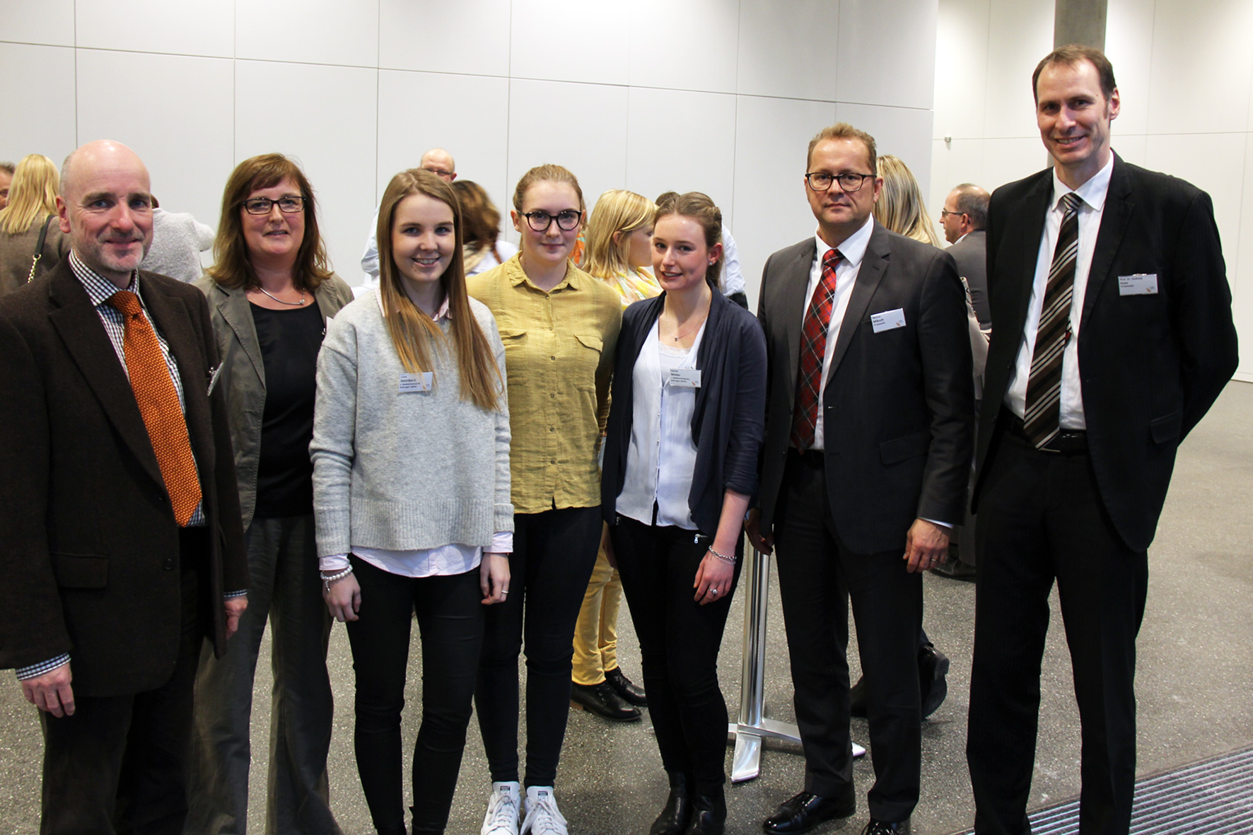Über die Verzahnung von Studium und Praxis referierten Heike Jennert als Ansprechpartnerin der kaufmännischen Ausbildung bei den von Bodelschwinghschen Stiftungen Bethel sowie die Studentinnen Marie Sophie Hauhart, Leonie Müller und Luisa Steinbeck. Die jungen Frauen absolvieren ihr Studium der praxisintegrierten BWL in Kombination mit der Ausbildung zur Kauffrau im Gesundheitswesen bei den von Bodelschwinghschen Stiftungen. Es gebe über 20 verschiedene Verwaltungsabteilungen in Bethel und Eckardtsheim, in denen die Auszubildenden und Studierenden in der kaufmännischen Ausbildung eingesetzt werden können, erklärte Jennert. Die Erfahrungsberichte der Studentinnen waren durchweg positiv: „Der Wechsel zwischen Praxisphasen und Arbeit ist gut“, findet Marie Sophie Hauhart. Eine Entscheidung zwischen Ausbildung und Studium möchte auch Leonie Müller nicht treffen: „Auf jeden Fall BWL und auf jeden Fall Ausbildung“, sagte sie. Ebenfalls aus der Praxis berichtete Wiebke Meyer-Rahde, Studentin im 7. Semester des praxisintegrierten Studiengangs Wirtschaftsingenieurwesen am Studienort Gütersloh und Auszubildende bei BOGE KOMPRESSOREN in Bielefeld. Sie stellte ihre Bachelorthesis zur szenariobasierten Entwicklung eines Geschäftsmodelles für den Bereich Aftermarket des Unternehmens Boge Kompressoren im Rahmen von Industrie 4.0 vor.