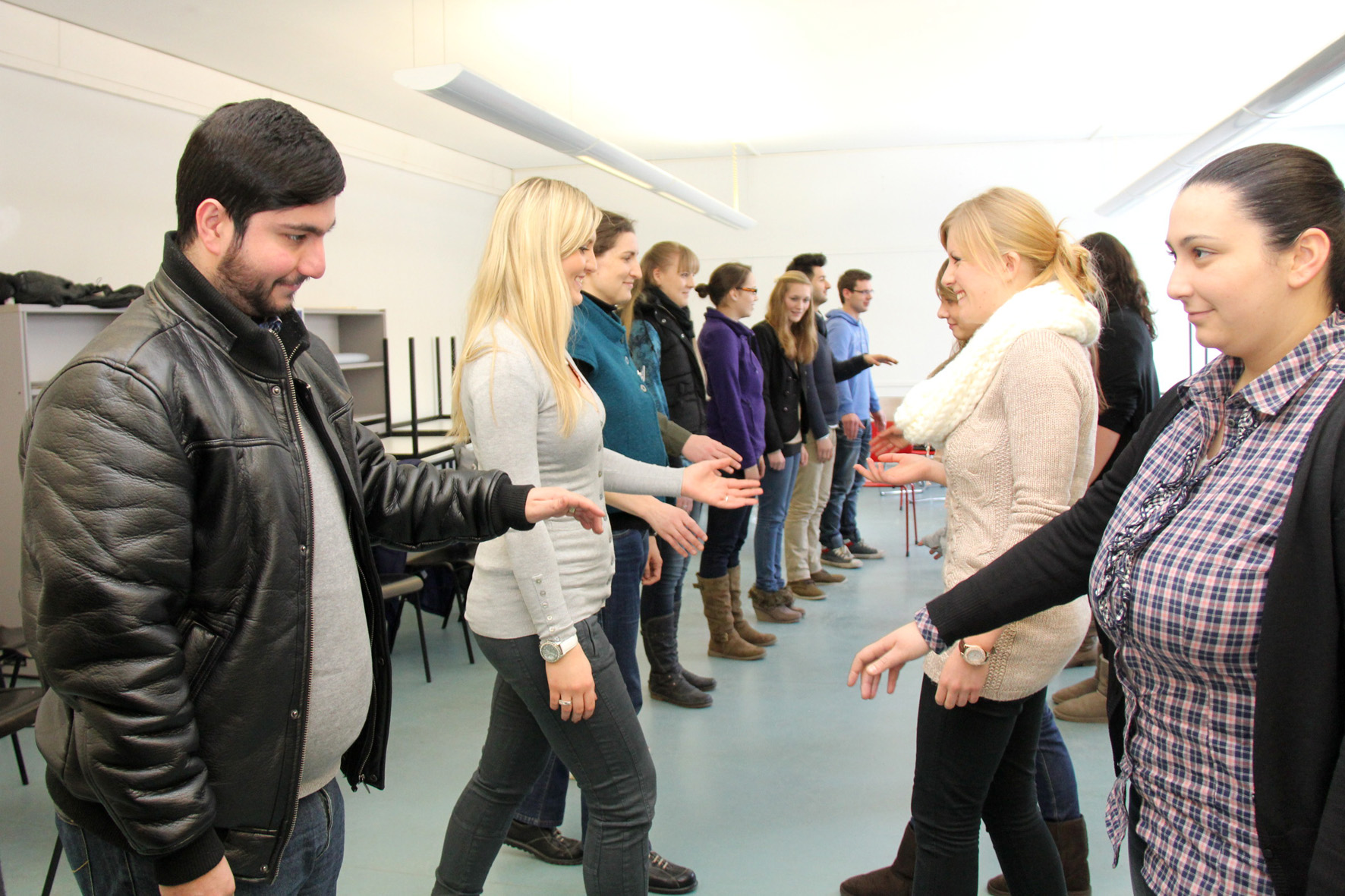Die Vorlesung von Professor Ausländer riss die Schülerinnen und Schüler im wahrsten Sinne des Wortes von den Hockern, denn sie lernten einen komplizierten Folkloretanz: den Grand Square. Dabei achteten sie nicht auf Schritte und Zählzeiten, sondern beobachteten, wie sich ihr Gegenüber bewegte. Der Spaß hatte einen tieferen Sinn, denn auch im Studium am Fachbereich Sozialwesen sammeln die Studierenden ein Repertoire an Tänzen und Liedern aus unterschiedlichen Kulturen. Wer den Studienschwerpunkt musikalische Bildung wählt, baut zudem Instrumente, lernt Trommeln und spielt Gitarre. Die Verbindung von Pädagogik und Musik findet Ann-Kathrin Mense (18 Jahre) vom Gymnasium Harsewinkel toll: "Bei meinem Praktikum im Kindergarten haben wir viel mit den Kleinen musiziert. Das hat allen Spaß gemacht."