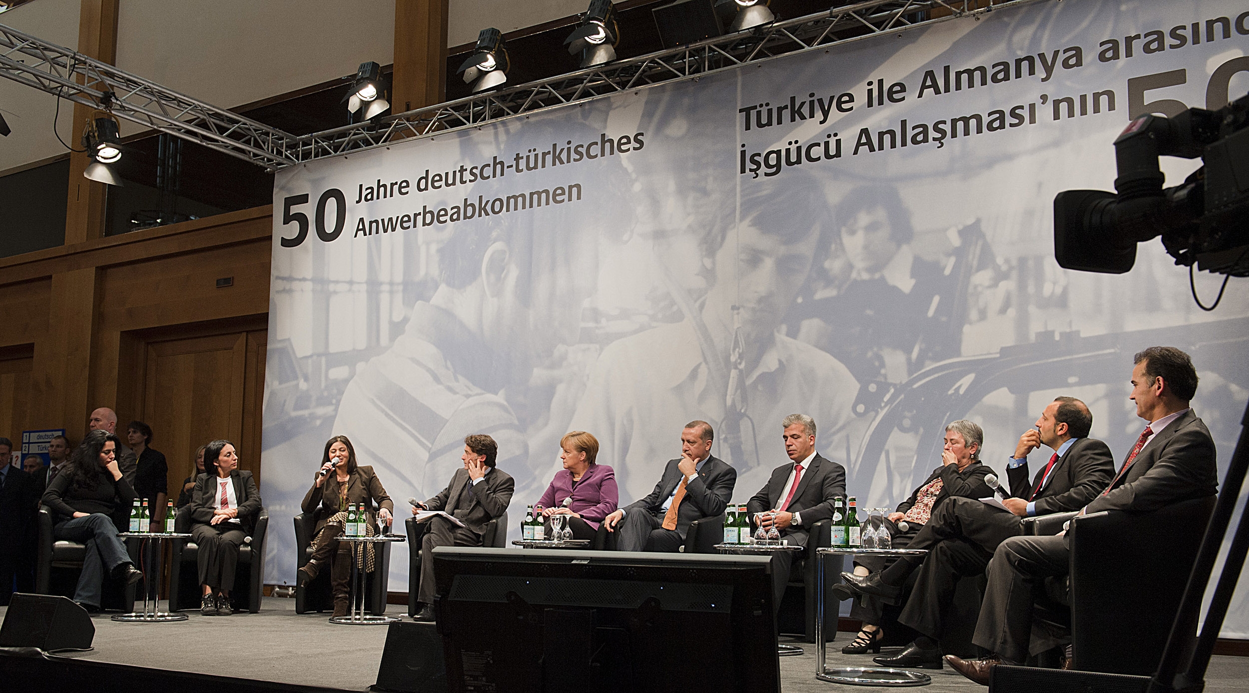 50. Jahrestag deutsch-türkisches Anwerbeabkommen. / Prof. Dr. Riza Öztürk diskutiert mit Angela Merkel und Recep Tayyip Erdogan.