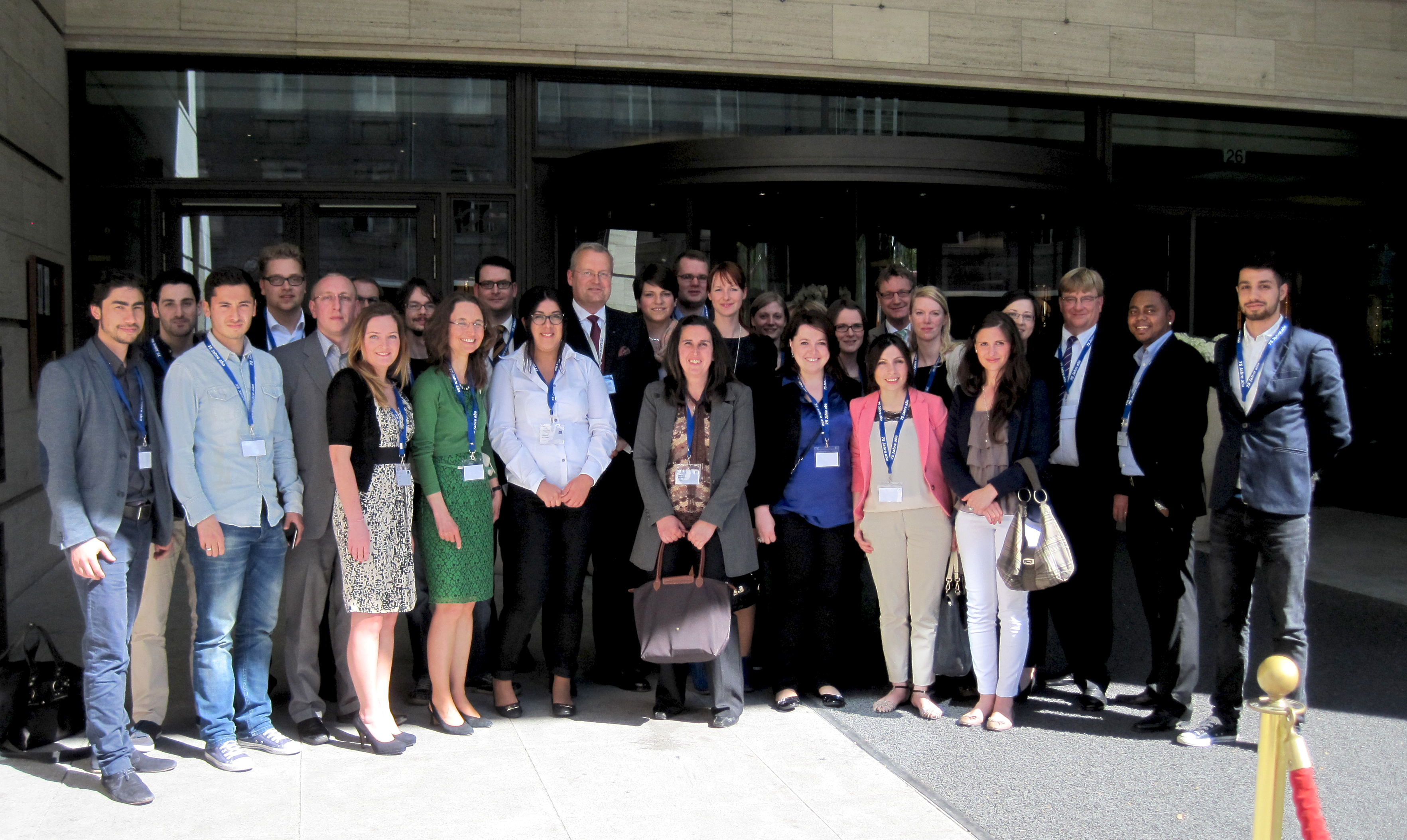 Bielefeld/Berlin (fhb). Für die Altersversorgung nach Berlin. Auf Einladung von Klaus Stiefermann, Geschäftsführer der Arbeitsgemeinschaft für betriebliche Altersversorgung e.V. (aba), haben 24 Studentinnen und Studenten des Studienganges Wirtschaftsrecht an der 75. Jahrestagung der aba in Berlin teilgenommen. Im Rahmen der Lehrveranstaltung "Seminar zu Personal" waren sie zusammen mit den Professoren Dr. Axel Benning, Dr. Christiane Nitschke und Dr. Jörg-Dieter Oberrath, Fachbereich Wirtschaft und Gesundheit, in die Hauptstadt gereist. Auf der Jahrestagung erhielten die Studierenden Einblicke zum momentanen Stand der betrieblichen Altersversorgung und erfuhren, welche Relevanz sie für die heutige Lebensplanung hat. Auch beim Gastvortrag der Bundesarbeitsministerin Ursula von der Leyen und im Austausch mit Ex-Bundesarbeitsminister Walter Riester erfuhren die Studierenden wichtige Aspekte zur betrieblichen Altersversorgung.