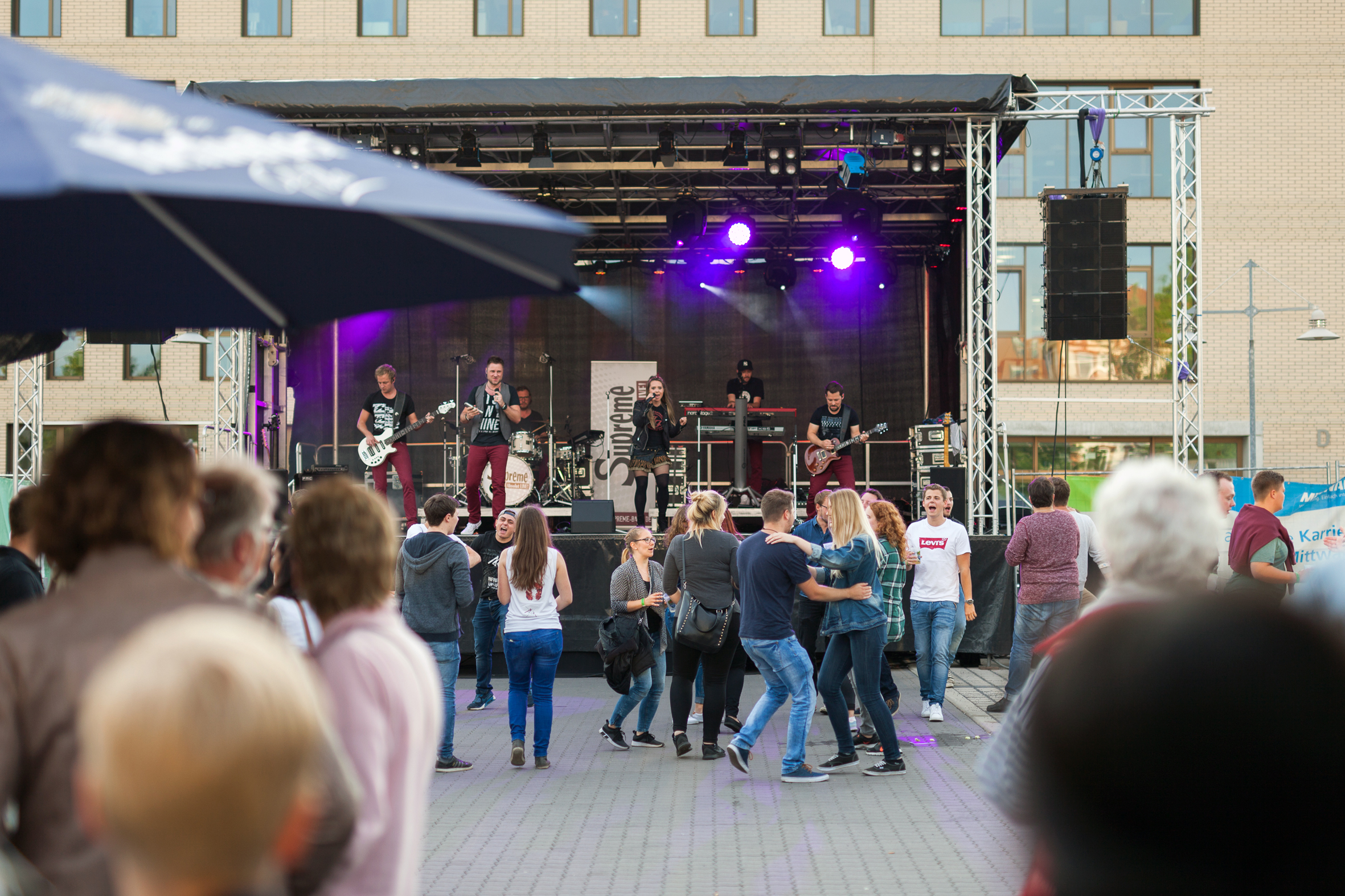 Ganz wesentlich beteiligt und deshalb verantwortlich für den Abend und das musikalisch abwechslungsreiche Programm zeichneten weitere Fachschaftsmitglieder, nämlich Jonas Michel, Jan-Philipp Jansen, Michael Glöckner und Sebastian Kögel. Auf der Bühne gaben jeweils ihr Bestes die Bands Titus, Old Time Jazz Band, Superphonix, Supreme-Absolut Live und DJ Schi.T.Happens. Für das leibliche Wohl sorgten einige Verpflegungsstände. Also ein musikalisch-kulinarisches Sorglos-Paket, ergänzt um eine Kletterwand, die eine bekannte Krankenkasse aufgestellt hatte. Abgestürzt ist dort niemand – wie es den feiernden Festival-Freunden spätnachts ging, ist allerdings nicht überliefert. Weitsichtig planend hatten die Fachschaftsvertreter einen kostenlosen Shuttle-Bus organisiert, der gegen Mitternacht zahlreiche Festival-Teilnehmer zur Mindener Musikbox chauffierte. Ende offen.