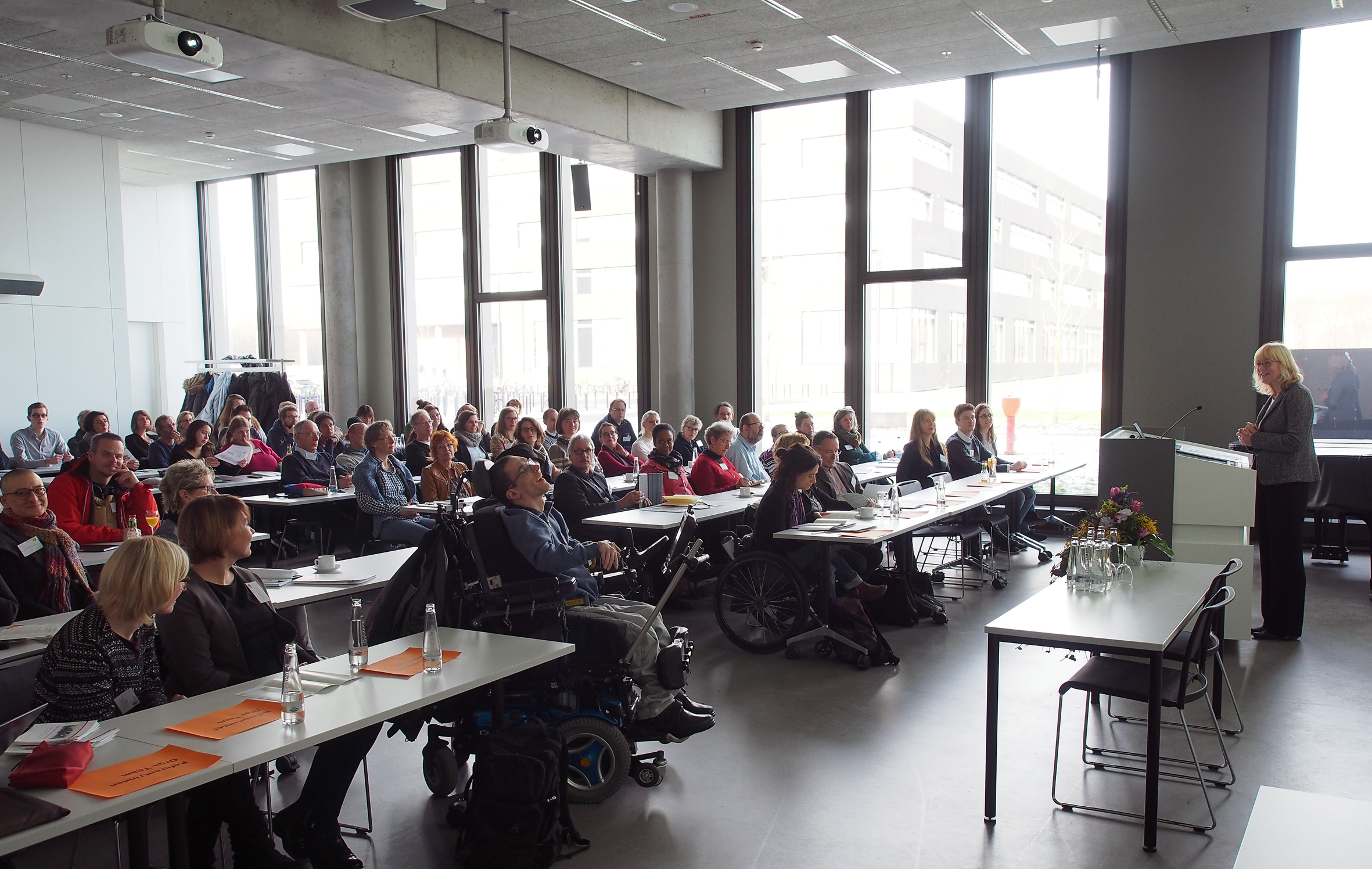 Bielefeld (fhb). „Die Fachtagung war durch und durch ein voller Erfolg, alle Beiträge waren hoch spannend und sehr lehrreich.“ Das Fazit von Prof. Dr. Gudrun Dobslaw hätte kaum besser ausfallen können. Getroffen hatten sich am vergangenen Wochenende im Konferenzraum der FH Bielefeld auf dem Campus Nord rund 120 Interessierte. „Eine ungewöhnliche Zusammensetzung des sonst sehr einheitlich zusammengesetzten Publikums“, so Dobslaw. Gemeinsam diskutierten Menschen mit Behinderung, ihre Angehörigen, Vertreterinnen und Vertreter von Dienstleistungsunternehmen und Vereinen sowie Wissenschaftlerinnen und Wissenschaftler aus ganz Deutschland. Ihr Thema: Gestaltung partizipativer Prozesse.