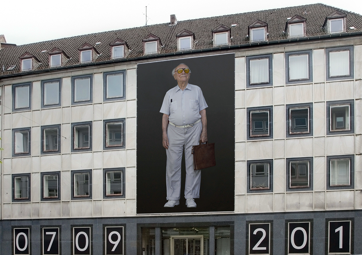 An der Fassade der Alten Stadtbibliothek Bielefeld ist seit einigen Tagen eine großformatige Fotografie zu sehen. Sie hängt direkt über dem Eingang an der Herforder Straße und reicht vom ersten Stockwerk bis unter das Dach des Gebäudes. Sie zeigt einen älteren Mann mit markanter Hornbrille, bekleidet mit weißen Sportschuhen, hellblauer Hose, einem weißen Gürtel und hellblauem Kurzarmhemd. Aus der Brusttasche seines Hemdes ragt das Ende eines Frisierkamms. In der Hand hält er eine braune Aktentasche. Sein Blick ist nach oben schauend auf einen Gegenstand außerhalb des Bildraumes gerichtet. Den Hintergrund des Bildes bildet eine monochrom schwarze Fläche, die den Mann zu allen Seiten umgibt. Sie lenkt die ganze Aufmerksamkeit des Betrachters auf die dargestellte Person und isoliert sie zugleich aus ihrem Kontext. Unterhalb des übergroßen Bildbanners ist die großformatige Zahlenreihe »07092014« an Fenstern der Alten Stadtbibliothek im Erdgeschoss platziert. An den Schaufenstern der Alten Stadtbibliothek an der Wilhelmstraße sind ebenfalls großformatige Fotografien zu sehen. Sie zeigen jedoch nicht ein einzelnes übergroßes Menschenbild als Ganzkörperporträt, sondern riesige Vergrößerungen und Bildausschnitte, in denen es um Menschenbilder in vielfältigen Variationen, Details und Arrangements geht.