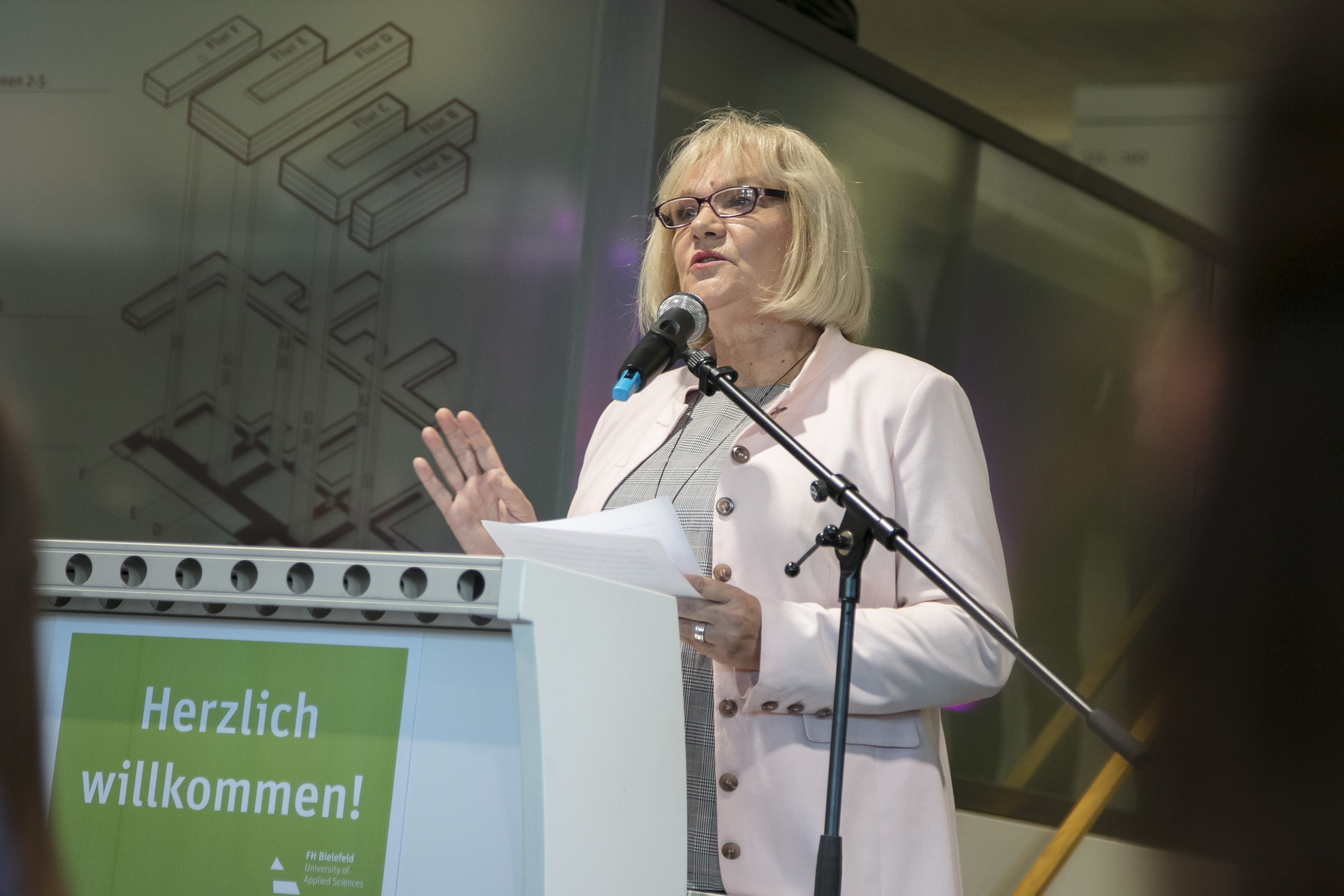 Karin Schrader, Bielefelds Bürgermeisterin, begrüßte in Vertretung von Oberbürgermeister Pit Clausen die neuen Studierenden: „Ich kann Ihnen nur herzlich gratulieren. Sie haben sich für die richtige Hochschule entschieden in der richtigen Stadt. Bielefeld ist bunt, weltoffen und hat viele Möglichkeiten des Lernens, aber auch der Freizeitgestaltung.“ Sie ermunterte ihre Zuhörer, in Bielefeld ihren ersten Wohnsitz anzumelden. Denn im Rahmen einer kleinen „Willkommens-Kampagne“ erhalten die jungen Neubürger zurzeit einen roten Bielefeld-Becher und Gutscheine für das Campus-Festival, den Kletterpark und den Weihnachtsmarkt.