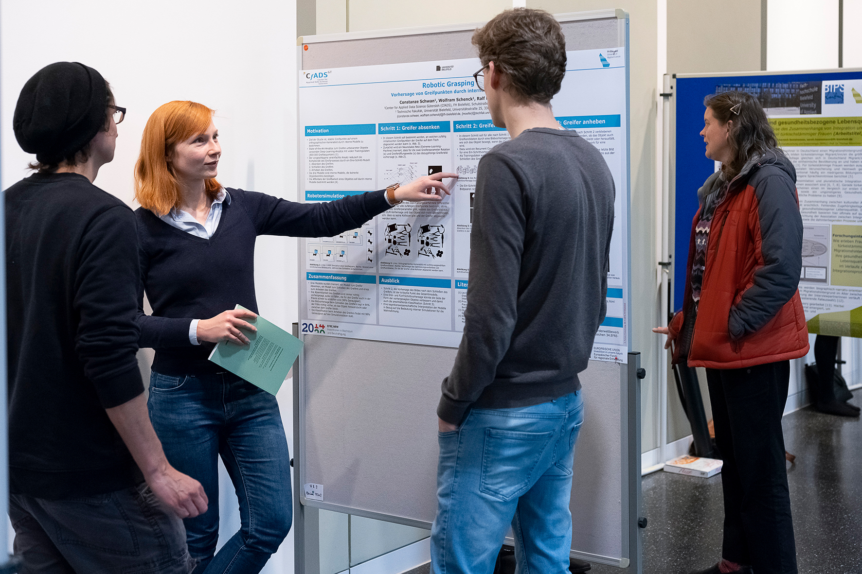Am Nachmittag stellten die Promovierenden ihr Promotionsvorhaben bei der Posterausstellung vor und standen für Fragen zur Verfügung. Die Ausstellung stieß reges Interesse unter den Studierenden, die sich hier zu Themen wie z.B. „Dynamische Fluchtweglenkung im intelligenten Gebäude“ oder „Automatisierte Pollenanalyse – Moderne Mustererkennung in der Palynologie“ informieren konnten.