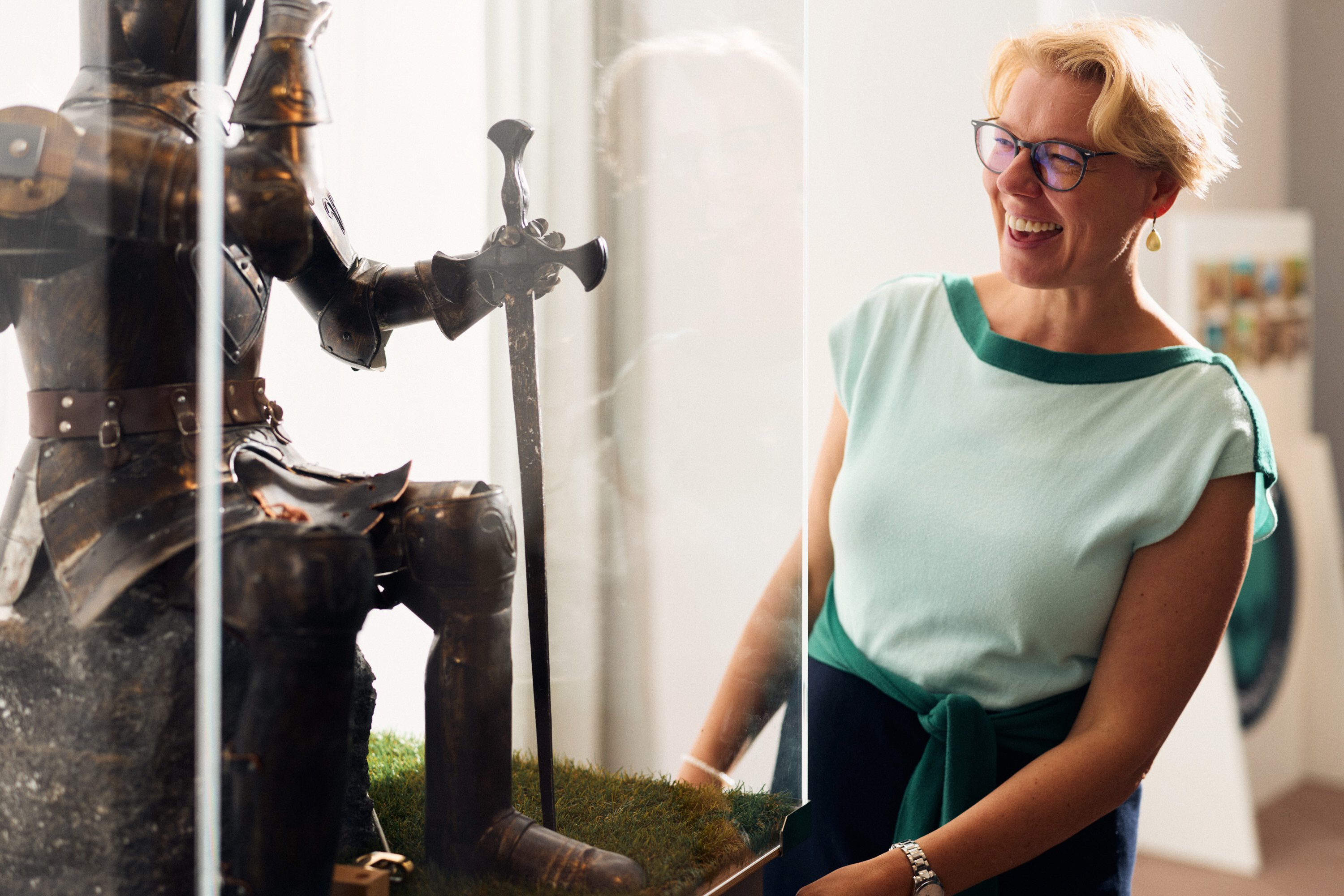 Inzwischen ist der Ritter im Ausstellungssaal des Schlosses angekommen und wird von Susanne Hilker in Empfang genommen. Die Kuratorin des Weserrenaissance-Museums dirigiert ihn an seinen Platz auf einem Sockel und strahlt: „Er passt perfekt hierher.“ Hilker hatte bei der Zusammenstellung der Ausstellung explizit den Ritter angefragt – nicht nur wegen seiner Rüstung. „Man kann ihn als den ersten humanoiden Roboter bezeichnen“, erklärt Andreas Wollensak und drückt auf einen kleinen weißen Knopf am Sockel. Bedächtig hebt der Ritter seinen Arm zu einem freundlichen Gruß. Wollensak: „Leonardo hat zahlreiche automatische Mechanismen gezeichnet, Apparate und Maschinen, die sich selbsttätig bewegen. Heute sind automatische Systeme fester Bestandteil unserer Gesellschaft, etwa in der industriellen Fertigung.“ Genau solche Anknüpfungspunkte will Hilker in der Ausstellung aufzeigen: „Viele der heute selbstverständlichen technischen Errungenschaften haben ihren Ursprung in der Renaissance.“