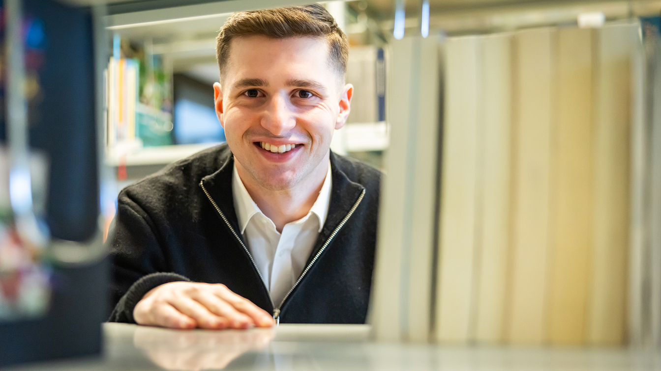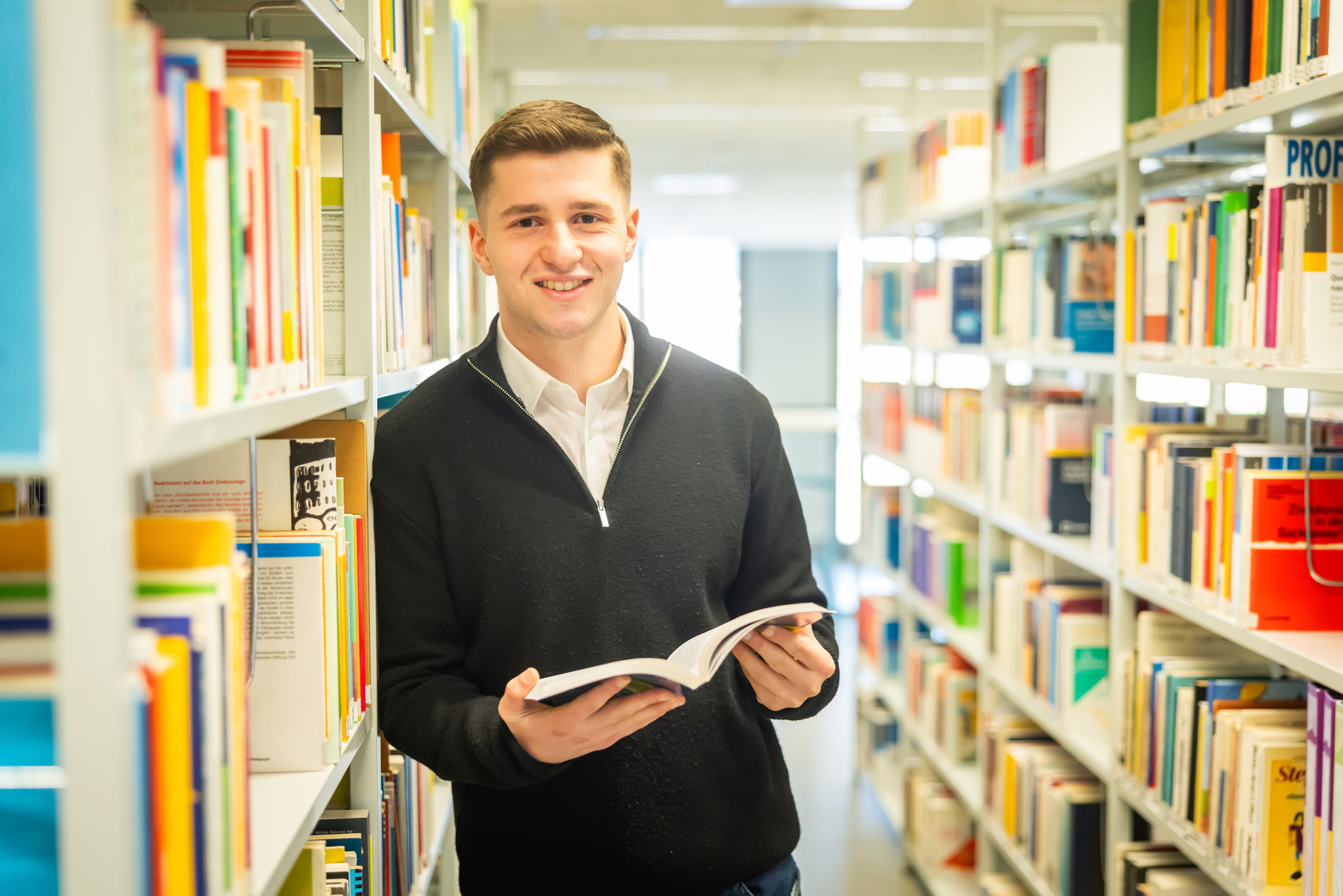 Die Zahlen sprechen eine deutliche Sprache: Nur jeder vierte Studierende hierzulande kommt aus einer Familie, die einen nicht-akademischen Hintergrund hat. Adem Cirakoglu ist einer davon. Seinen Bachelor in Wirtschaftsingenieurwesen hat er an der HSBI innerhalb kurzer Zeit mit Bestnote absolviert. Inzwischen ist er ehrenamtlich für die Organisation ArbeiterKind.de unterwegs. Adems Geschichte soll andere ermutigen, ihren Weg an eine Hochschule zu finden.Adem Cirakoglu in der Bibliothek des HSBI-Hauptgebäudes.