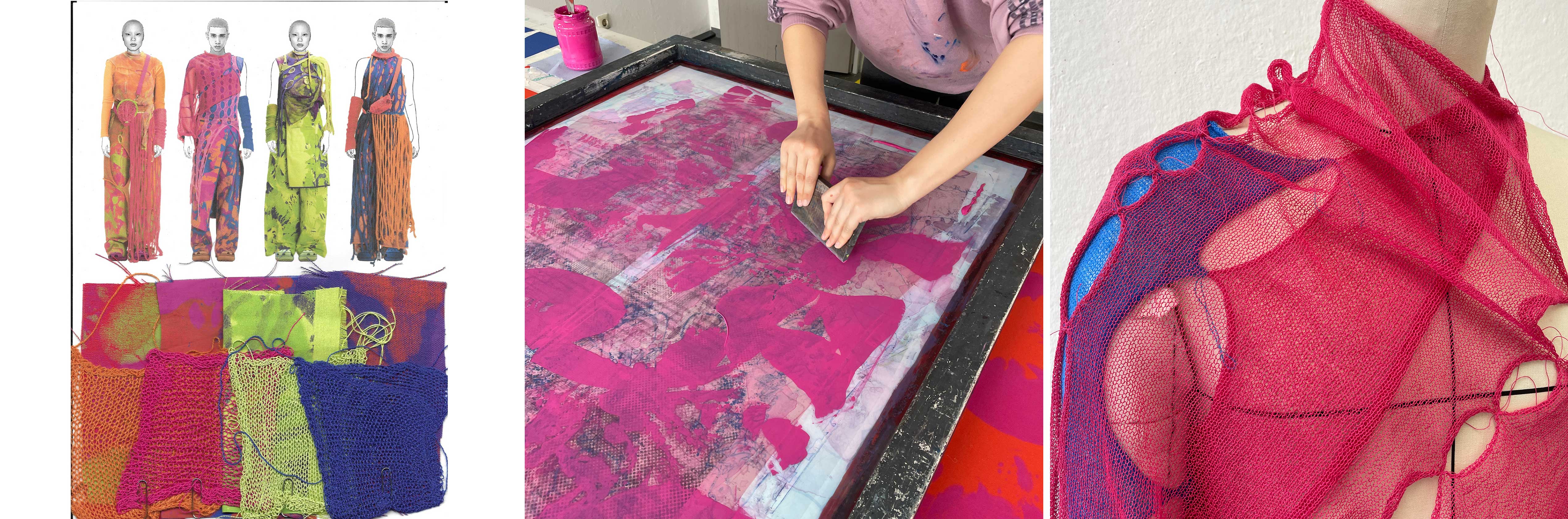 Blaues Wasser in Bewegung, das Wachsen vermeintlich starrer Korallen, grün wogende Algenwälder und zwischen Korallen versteckte Meerestiere – gemeinsam bilden sie ein in Balance befindliches Ökosystem. Diese Balance wird aber von Menschen durch Umweltverschmutzung, Klimawandel, Überfischung und weitere Einflüsse gestört. Die Bachelorarbeit Anthropogenic – The drowning ocean macht mit textilen Mitteln auf Missstände aufmerksam: Die Textilien setzen sich auf der einen Seite aus sehr feinem, zartem, fragilem Strick und auf der anderen Seite aus schweren, festen und bedruckten Stoffen zusammen. Sie sind kontrastreich und bilden dennoch eine harmonische Symbiose. Durch das gemeinsame Farbkonzept wird ein Gleichgewicht erschaffen. Inspirationen für die Kollektion waren die ohne technische Hilfsmittel arbeitenden Haenyo-Taucherinnen aus Südkorea, in Geisternetzen gestorbene Meereslebewesen und Korallen.