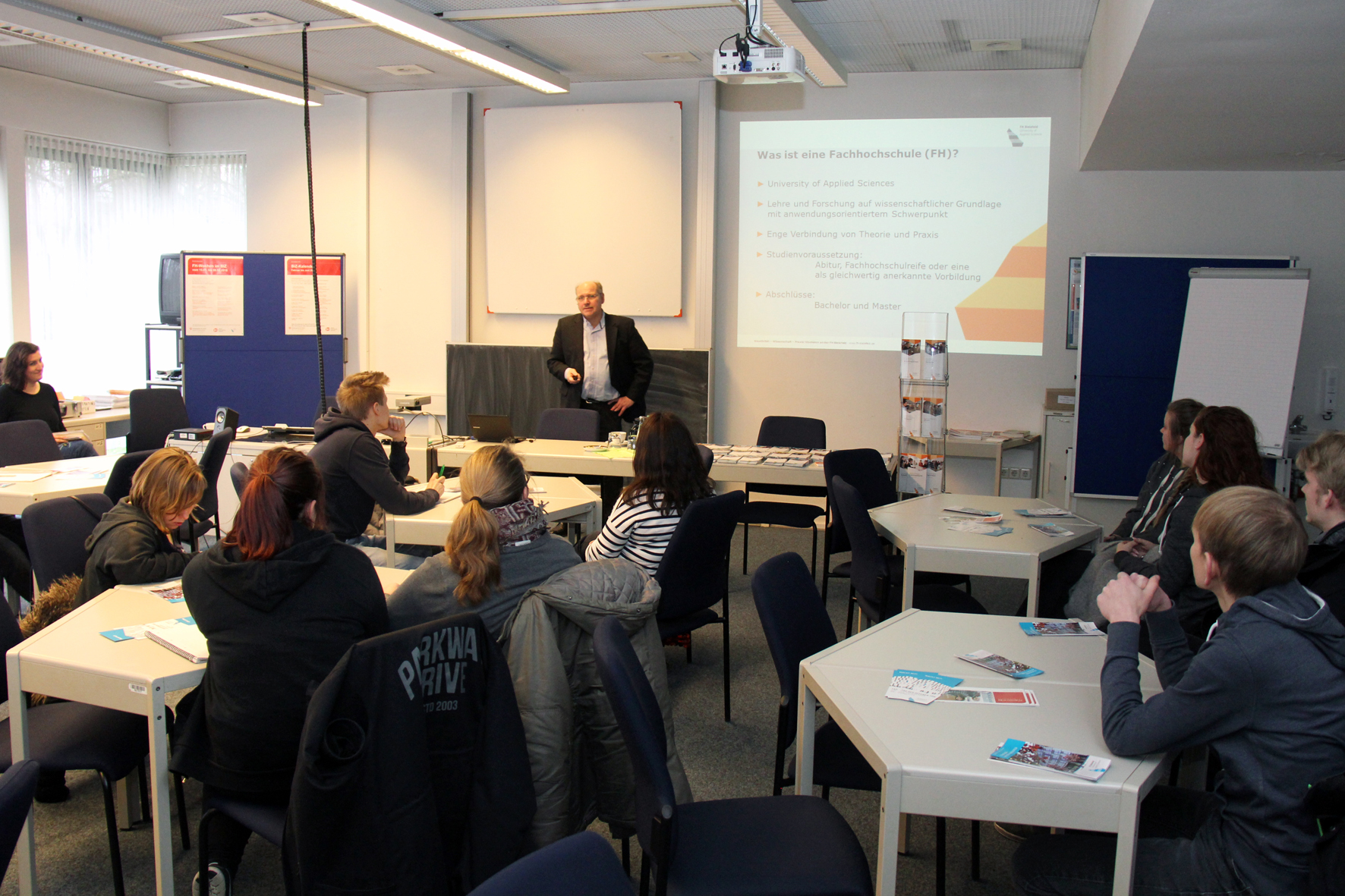 Bielefeld (fhb). Gestern eröffnete Professor Dr. Jörg-Michael Keuntje die jährlich stattfindenden FH-Wochen für Studieninteressierte im Berufsinformationszentrum (BiZ) der Agentur für Arbeit. Bis zum 8. Februar stellen Professorinnen und Professoren sowie wissenschaftliche Mitarbeiterinnen und Mitarbeiter 31 Studiengänge der Fachhochschule (FH) Bielefeld vor. Das Programm beinhaltet Studiengänge verschiedener Studienmodelle am Campus Bielefeld, Campus Minden und am Studienort Gütersloh.