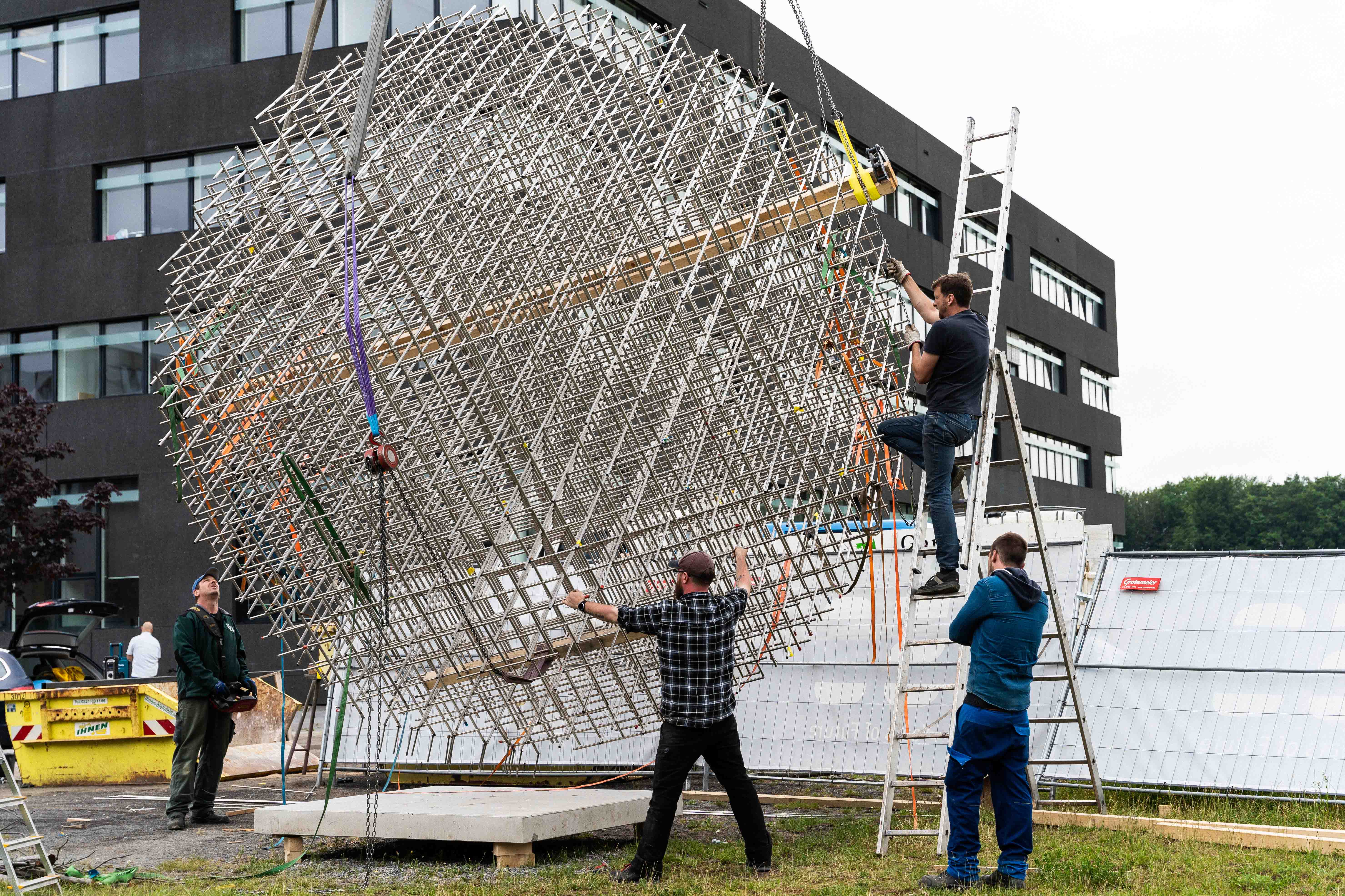 Die kugelförmige Plastik aus Edestahlstäben hat einen Durchmesser von rund sechs Metern.