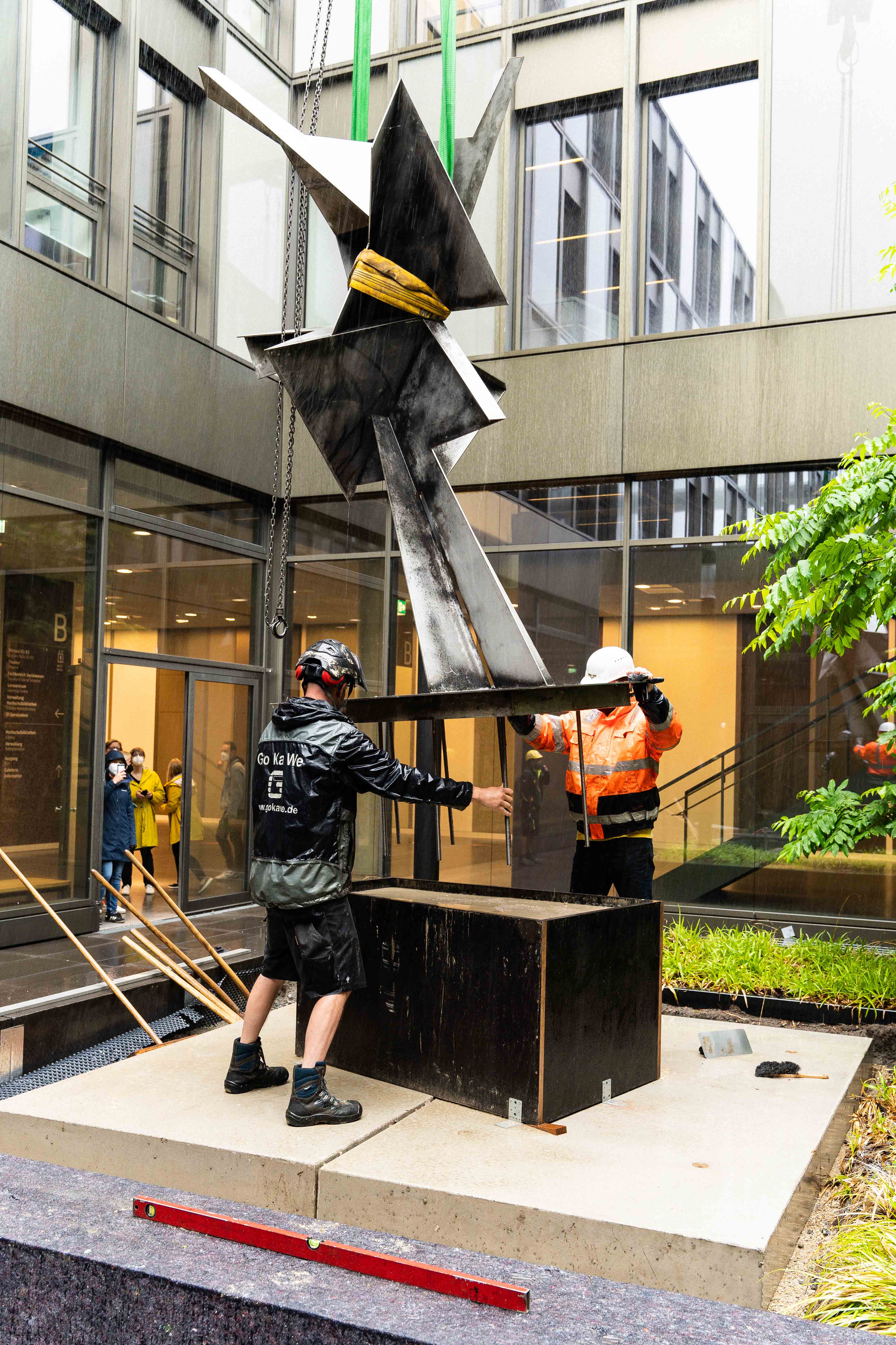 Das Kunstwerk von Hans Uhlmann ist an seinem neuen Standort angekommen.