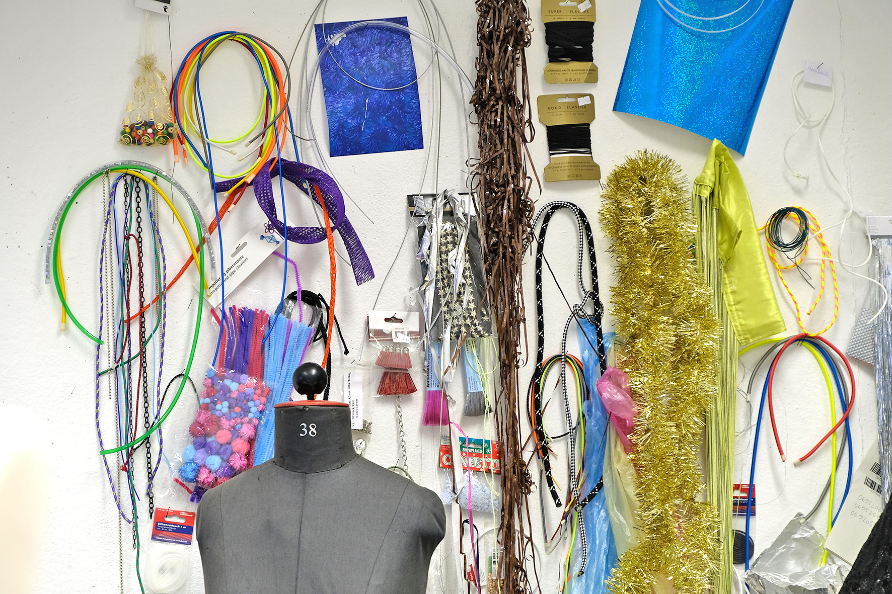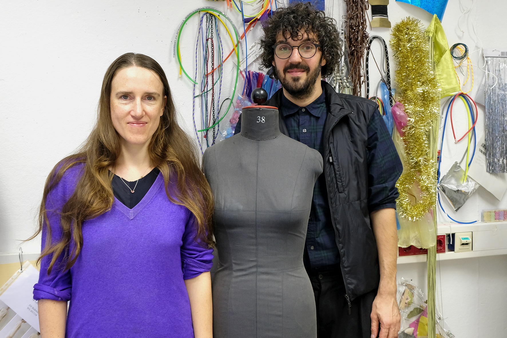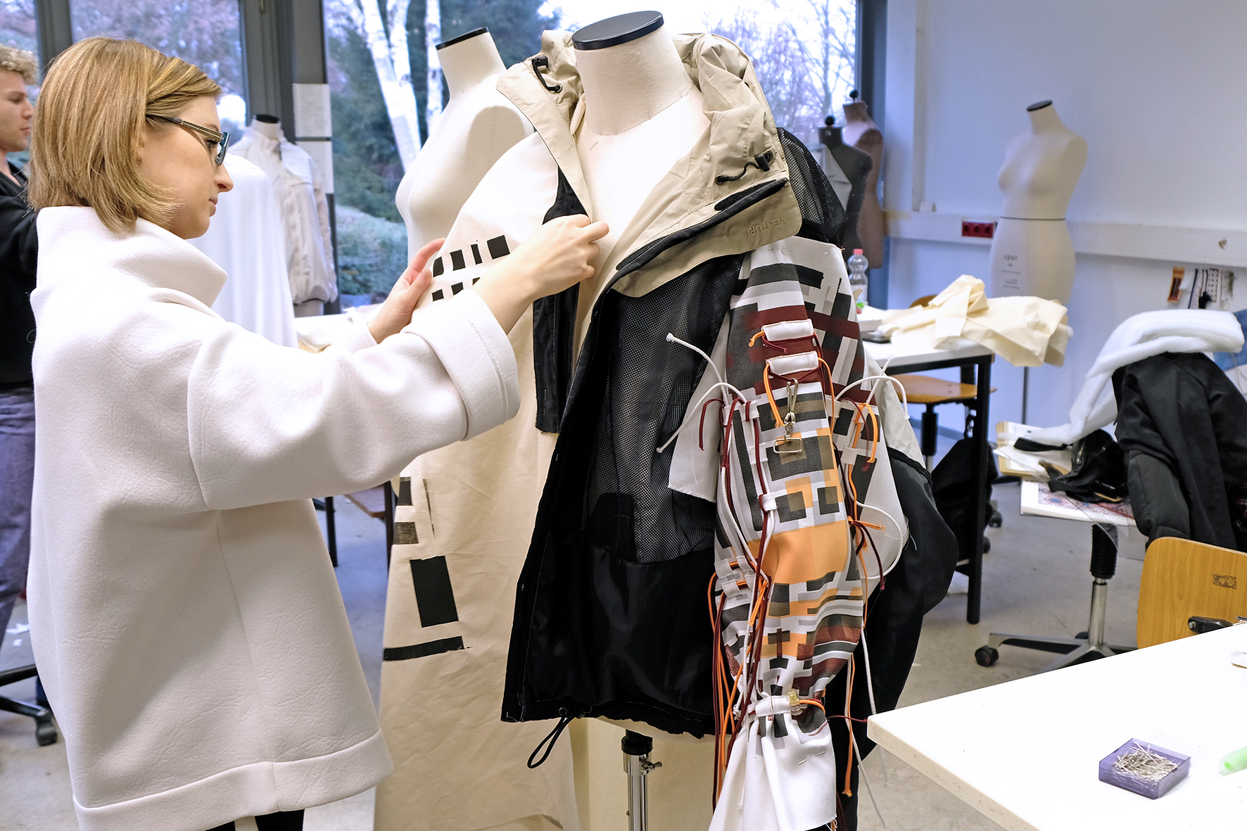 In einem Workshop experimentieren die Studierenden in dieser Woche mit den verschiedenen Techniken und setzen erste Ideen um. Statt mit gekaufter Meterware arbeiten die 14 Teilnehmenden des Seminars mit selbst hergestellten Materialien wie geknoteten Abschleppseilen, gebrauchten Plastiktüten oder „Second-Hand“-Kleidungsstücken. Geleitet wird der Workshop neben Professor Philipp Rupp von der internationalen Designerin Daphne Correll. „Der Workshop soll Freiraum bieten und den Studierenden die Möglichkeit geben, sich auszuprobieren“, erläutert die Designerin, die mit ihrer Zwillingsschwester 2006 das New Yorker Label correllcorrell gründete und in ihren Kollektionen Wert auf Nachhaltigkeit und Handwerk legt. Bereits in ihrer Abschlussarbeit setzten sich die Schwestern mit dem Thema auseinander und „upcycleten“ alte T-Shirts, die sie zu neuen Kleidungsstücken vernähten.