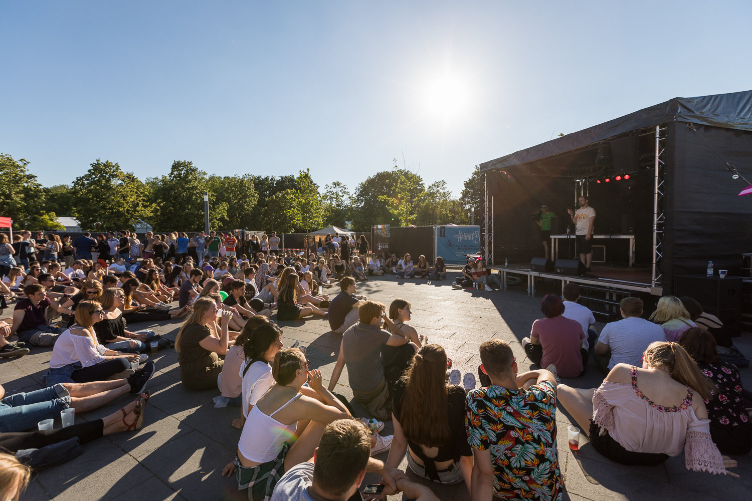 Wer sich zwischendurch entspannen wollte, konnte sich etwas fernab vom Getümmel einen Platz auf dem Sozialen Feld suchen. Vor der Slam Bühne lauschten zahlreiche Besucherinnen und Besucher im Sitzen den leiseren Klängen der Singer-Songwriter oder den Teilnehmerinnen und Teilnehmern des Hörsaal Slams. Einen Überblick über das Festivalgelände verschafften sich viele Besucherinnen und Besucher aus dem Campus Ballon.