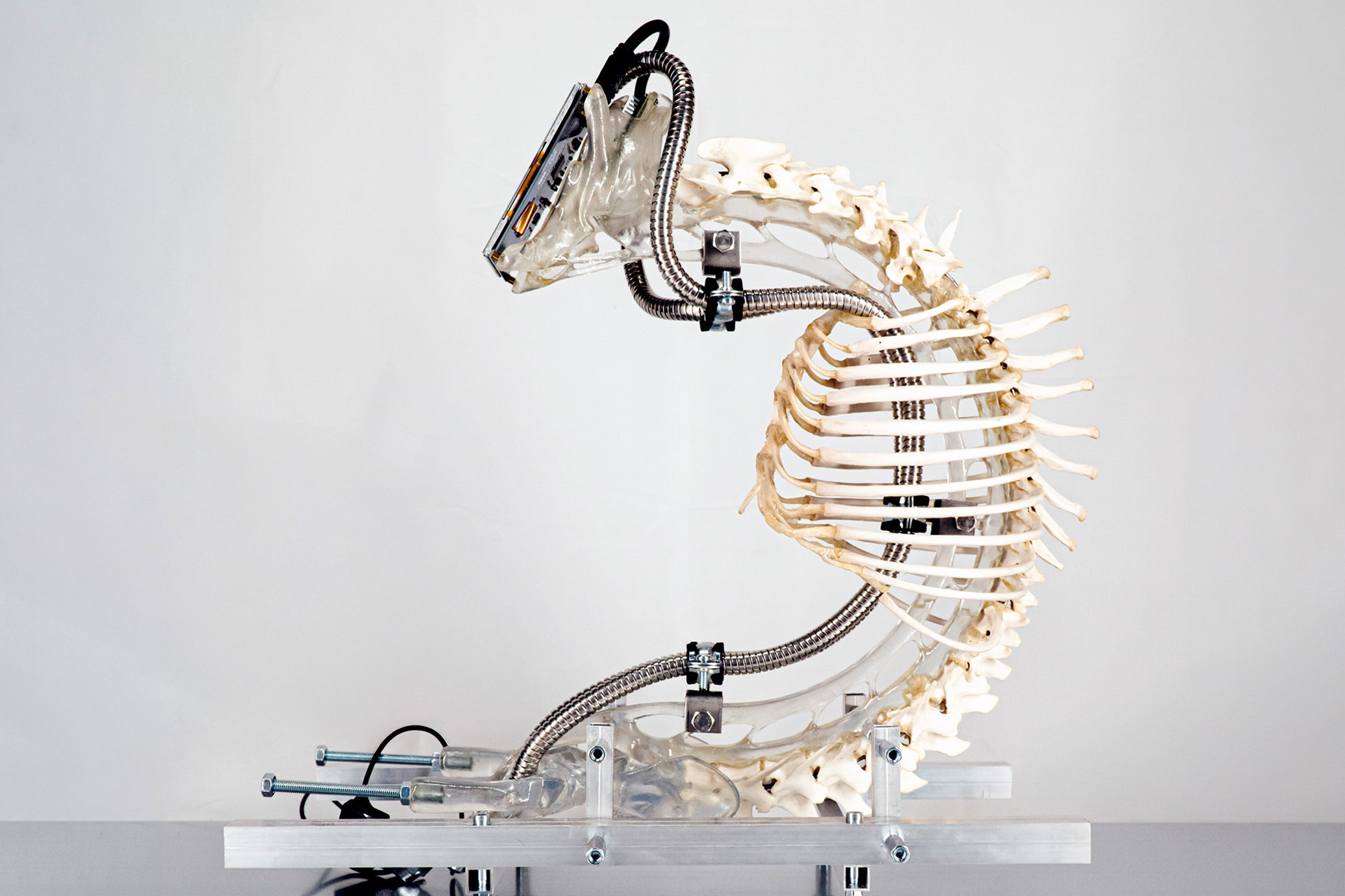 Zehn Skulpturen bilden die „Clinic of the Unbodied“. Jedesmal treten die Knochen von Tieren in Verbindung mit technischen Utensilien, medizinischen Instrumenten und algorithmischen Signalen. Man sucht nach den „Lebewesen“ in diesen prothetischen Konstruktionen, wobei sich deren „Körper“ aber nur immer weiter in Beziehungsgeflechten auflösen. Für die Arbeit „I Wish This Would Be The Shape of You“ etwa hat Herwig Scherabon die Wirbelsäule eines Hundes kreisförmig re-arrangiert und an die Stelle des Kopfes ein Display gesetzt. „Der Mensch projiziert seine Wünsche und Vorstellung auf andere Lebensformen“, erklärt er dazu. „Nur so konnte über die Jahrtausende der Wolf zum Chihuahua werden.“
