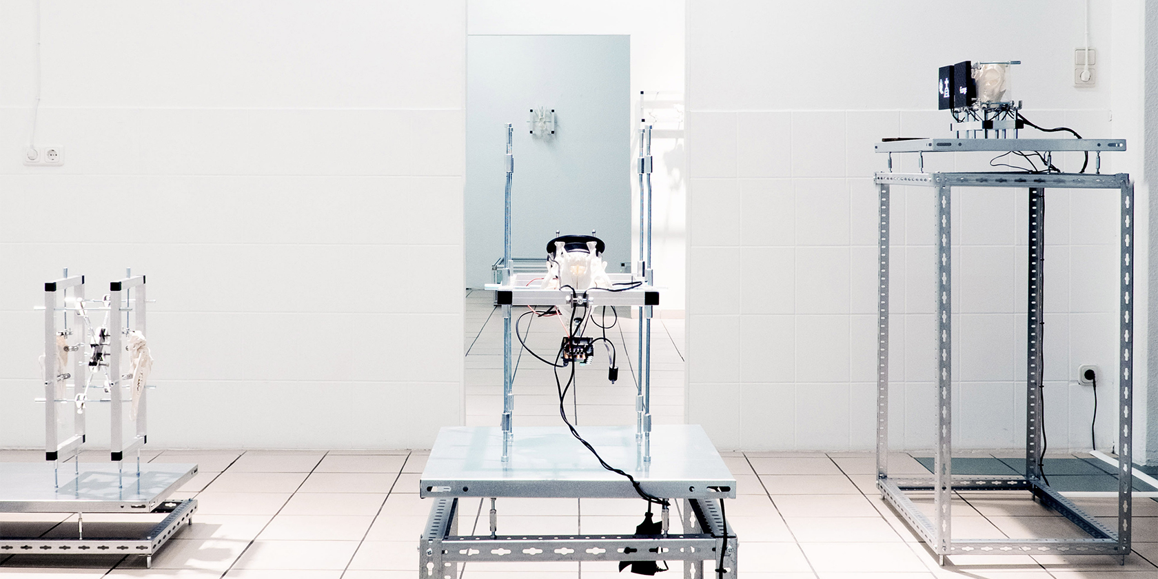 Der konstruktive Bau der Skulpturen stellte eine besondere Herausforderung dar. „Als gelernter Architekt habe ich ein Notizbuch voller Zeichnungen mit Schrauben, Dimensionen und Abmessungen“, erzählt Scherabon. „Die technische Planung ist für mich kein Problem. Man ertappt sich jedoch immer dabei, wie man ins Gestalten abrutscht. Bei der Künstlerischen Forschung geht es aber mehr um das Aufzeigen von Methoden und Prozessen. Es ist daher sehr wichtig, dass man technisch bleibt. Das Konzept für ‚The Clinic of the Unbodied‘ wäre viel schwerer lesbar, wenn es ästhetisiert wäre.“