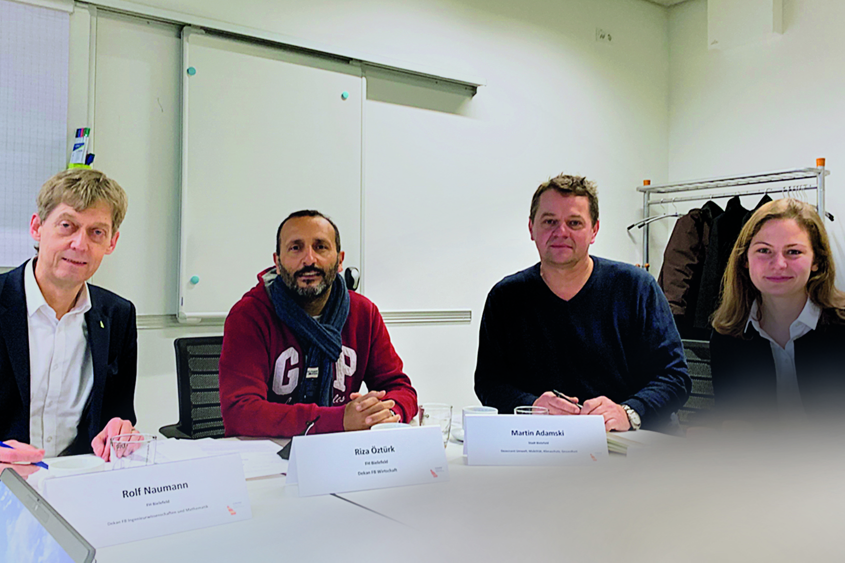 Die drei Partner wollen beim Thema Nachhaltigkeit eng zusammenarbeiten: gemeinsame Anträge bei Land und Bund verabredet.V.l.n.r. Prof. Dr. Rolf Naumann, Dekan des Fachbereichs Ingenieurwissenschaften und Mathematik, Prof. Dr. Riza Öztürk, Dekan des Fachbereichs Wirtschaft (beide FH Bielefeld), sowie Martin Adamski, Beigeordneter der Stadt Bielefeld für Umwelt, Mobilität, Klimaschutz und Gesundheit, und Nele Kohlstädt, Stadtwerke Bielefeld GmbH, bei einem ersten gemeinsamen Workshop.