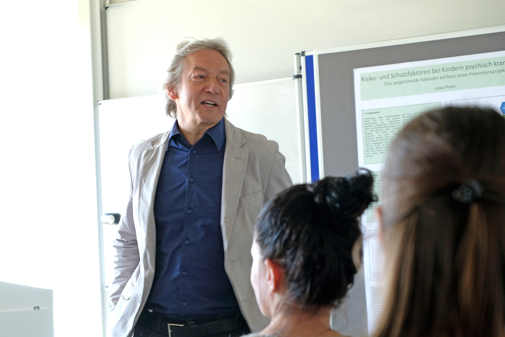 Einen ersten Einblick in die unterschiedlichen Themen der Abschlussarbeiten gaben die Absolventin Miriam Weinzierl und der Absolvent Waldemar Sperling, die die Veranstaltung und die Diskussionen moderierten. „Fragen sind sehr erwünscht", betonte Sperling, bevor er an Absolventin Lydia Pfeiffer übergab. Pfeiffer erforschte in ihrem Projekt „Risiko- und Schutzfaktoren bei Kindern psychisch kranker Eltern" die Frage, welche Faktoren die Wirkung eines Präventionsprojekts beeinflussen können.