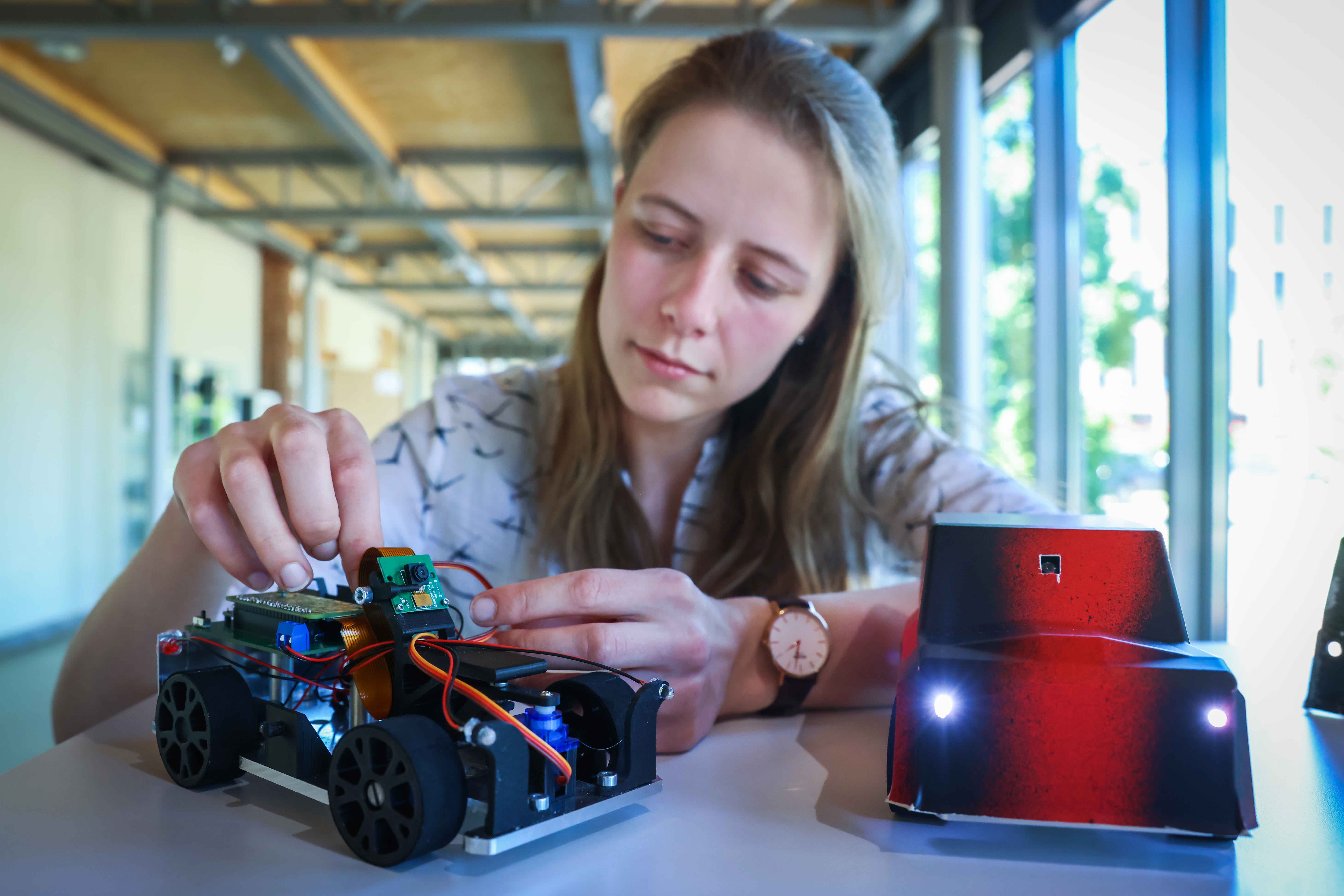 Die Studentin Carina Wittenbrink hat die Karosserie abgenommen und richtet die Kamera so aus, dass sie durch das Loch in der Windschutzscheibe die benötigten Daten für die Fernsteuerung aufnehmen kann.
