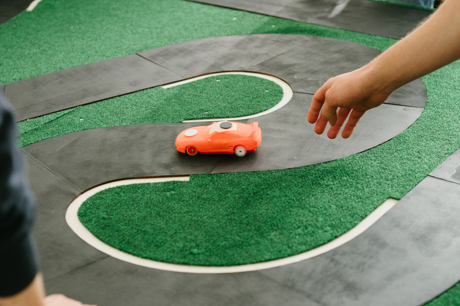Minden (hsbi). Gespannt stehen die Studierenden um eine Art Tischplatte herum. Zwischen grünem Filz schlängelt sich ein breites, graues Band ins Runde: eine Rennstrecke. Darauf in signalfarbenem Orange ein kleines Auto. Mattis Schrade tippt etwas am Computer ein – und der Wagen setzt sich in Bewegung. Wird schneller, schlingert ein bisschen hin und her, dreht aber schließlich eine gesamte Runde. Die Studierenden sind begeistert. „So gut hat das noch nie geklappt“, freut sich Schrade.