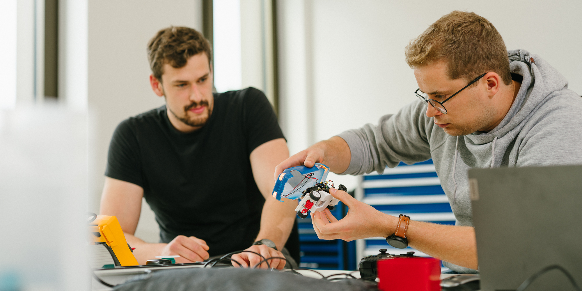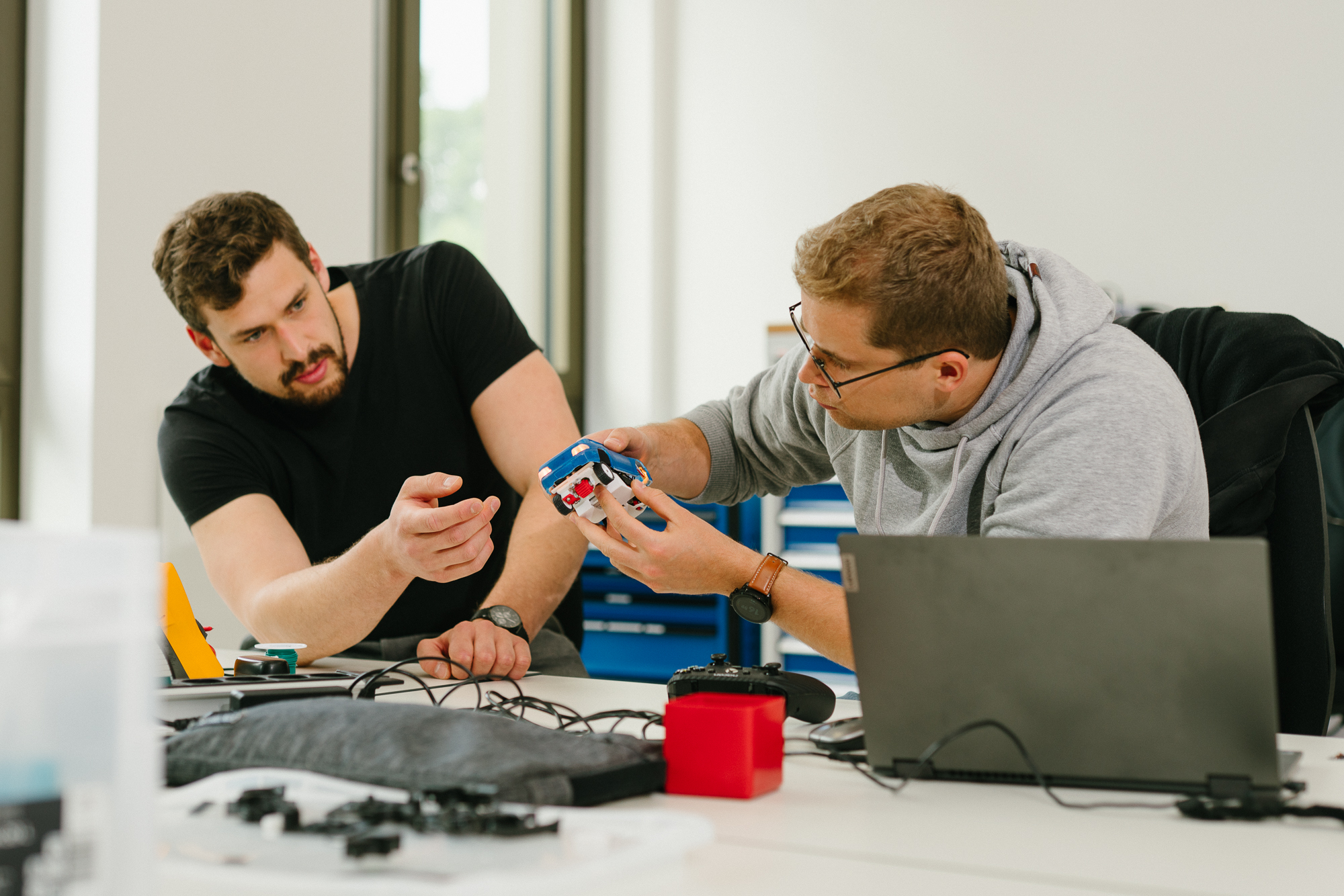 Gleich zu Beginn teilten sich die Studierenden in Arbeitsgruppen auf für die verschiedenen Teilaspekte des Projekts: Konstruktion, Lokalisierung, Regelung, Pfadplanung und Rennstreckenbau. Und sie lernten als erstes eine wichtige Tugend in der interdisziplinären Arbeit: Geduld. „Wir mussten erst mal abwarten, wieviel Platz uns die Maschinenbauer für das Regelungssystem geben konnten“, erzählt Christoph Luhmeyer, selbst angehender Elektroingenieur. Der kleine Maßstab war nämlich zugleich eine große Herausforderung. „Dadurch gibt es nur sehr wenig Bauraum, um alle notwendigen Teile unterzubringen“, erklärt Luhmeyer und nimmt vorsichtig die orangene Karosserie des kleinen Rennwagens ab. Zum Vorschein kommt geballte (Elektro-) Technik. „Wir brauchen unbedingt Lenkung, Antrieb, Steuerung, Licht.“ Luhmeyer grinst. „Und natürlich eine Unterbodenbeleuchtung.“ Wozu die nötig ist? „Na, es muss ja auch ein bisschen was hermachen!“ Eine Sonderausstattung also. Das macht ein PAW eben auch aus: „Die Möglichkeit, etwas auszuprobieren und umzusetzen, was nicht zu den Pflichtaufgaben und zum Standard in der industriellen Fertigung gehört“, sagt Philip Wette. Für die Studierenden sind solche selbstgewählten Extras offensichtlich eher Motivation als Belastung. „Das macht auch viel Spaß“, bestätigt Christoph Luhmeyer. „Sonst hätten wir nicht freiwillig bis 23 Uhr im Labor gesessen.“