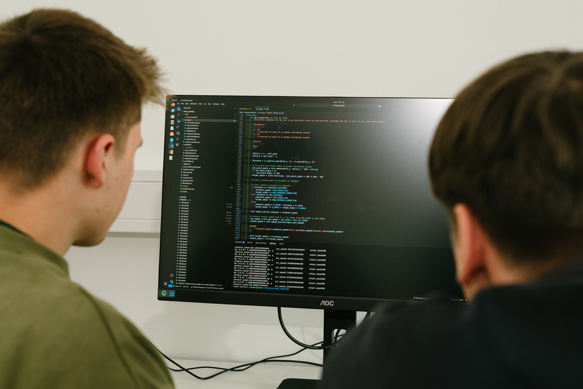 Als Controller wird ein ESP32-WroomMikrocontroller gesetzt. Er übernimmt die elektrische Ansteuerung der Aktoren des Rennwagens, also Antriebs- und Lenkungssystem. „Der Controller ist die Funkschnittstelle zum Fahrzeug, er überträgt die Anweisungen des Steuerungsprogramms auf die Aktoren und sorgt dafür, dass sich das Fahrzeug effizient und präzise auf dem errechneten Pfad bewegt“, erklärt Philip Wette. Egal, wo der Wagen gestartet wird: Eine Fish-eye-Kamera über der Rennstrecke erkennt das Fahrzeug und seine Bewegung, die Informationen werden zur Errechnung der optimalen Rennlinie in Echtzeit verwertet. „Dazu braucht es ein mathematisches Modell des Fahrzeugs. Wo befindet es sich? Wo soll es hin?“, skizziert Wette die Aufgabe der Pfadplanung. Die Studierenden imitieren dabei die Fahrersicht. „Als ob sie selbst im Fahrzeug sitzen und auf Sicht fahren würden. Sehen sie eine Kurve, lenken sie entsprechend.“ An der Rennstrecke schießt das Fahrzeug soeben über den Rand der Platte hinaus – und wird blitzschnell von den Studierenden aufgefangen. „Puh.“ Mattis Schrade am Rechner diagnostiziert: „Der Zielpunkt wird noch nicht sicher erfasst, der Algorithmus hat Probleme damit.“ Er ändert einige Parameter, jetzt hoppelt der Rennwagen quer über den Grünstreifen zwischen der Rennstrecke. „Immer noch etwas betrunken.“ Die Software-Entwicklung hat die zeitlichen Abhängigkeiten innerhalb des interdisziplinären Projekts besonders zu spüren bekommen. „Wir können das Programm ja erst testen, wenn ein fahrbares Fahrzeug fertig ist“, beschreibt Schrade das Problem. „Also jetzt.“