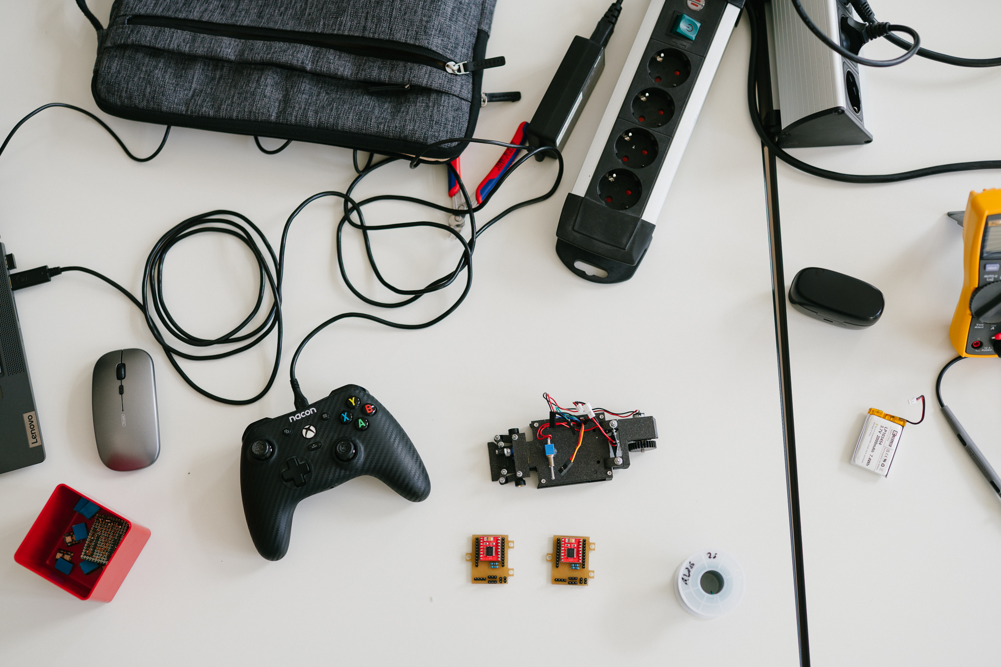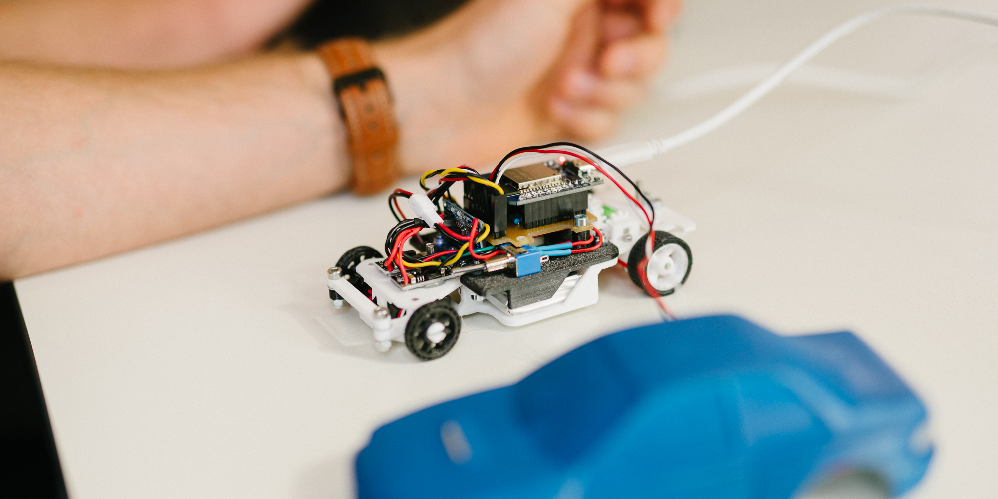 Viel Platz für das Regelungssystem blieb nicht, nachdem sich das Konstruktionsteam für eine klassische Ackermann-Lenkung mit Hinterradantrieb entschieden hatte. „Der alternative differentielle Antrieb mit bis zu vier individuellen Motoren hätte in dem Maßstab so filigran ausfallen müssen, dass wir das mit unseren relativ groben Fertigungsmethoden – dem 3D-Druck – nicht umsetzen konnten“, erklärt Philip Wette. Aus Platzgründen entschieden die Studierenden auch, die Steuerungsplatine selbst zu designen. Hendrik von Döllen stellt im Labor die Fräsmaschine an. „Dadurch können wir sie kompakter gestalten als die vorgefertigten Platinen“, sagt er und beobachtet genau, wie die Maschine die gewünschte Platine aus der Glasfaserplatte fräst. Den Rohling nimmt er mit zur Lötstation und setzt in Handarbeit präzise die erforderlichen Kontakte. „Das ist deutlich schwieriger zu löten als die gängigen Kupferplatten. Dafür können wir die Arbeit jederzeit im eigenen Labor erledigen und sind nicht auf Lieferzeiten angewiesen“, erklärt von Döllen den Aufwand. Ein wichtiger Aspekt auch im Hinblick auf die spätere Verwendung der Fahrzeuge. „Die Komponenten müssen auch für die nachfolgenden Studierenden einfach zu beschaffen und auszutauschen sein.“