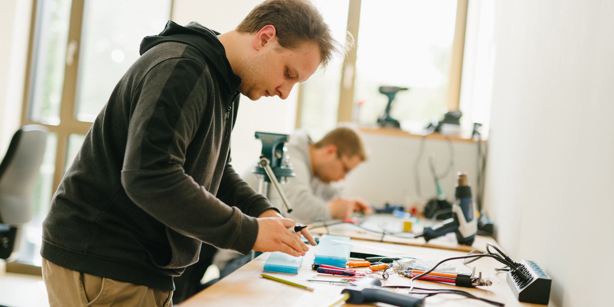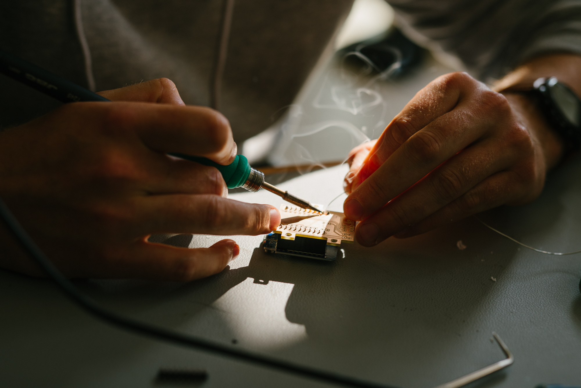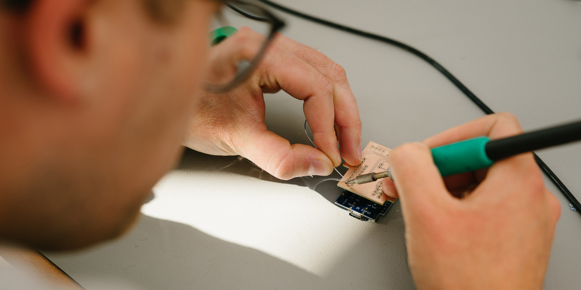 Student Hendrik von Döllen nimmt den Platinen-Rohling aus der hauseigenen Fräsmaschine mit zur Lötstation und setzt in Handarbeit präzise die erforderlichen Kontakte.