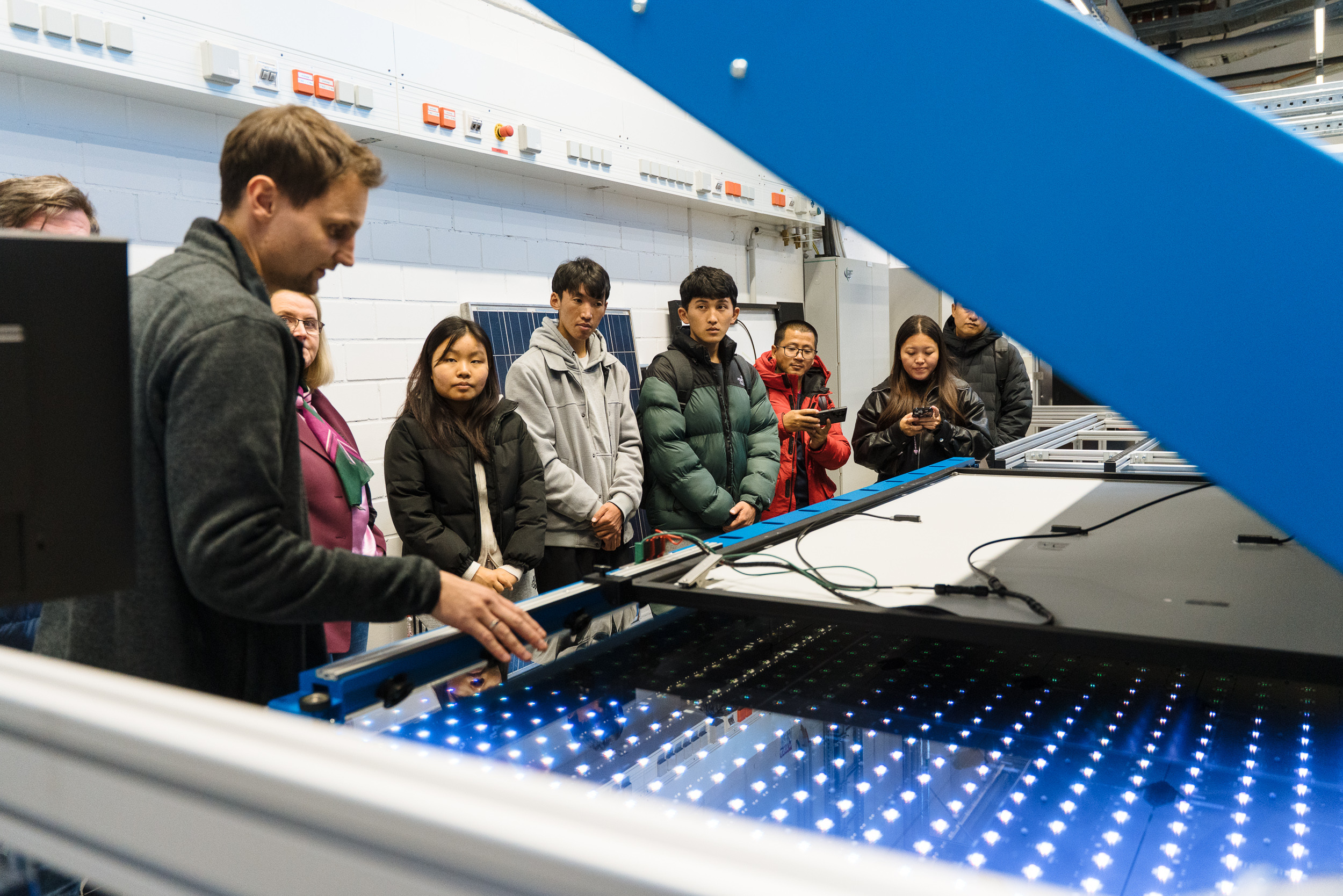 An den folgenden Tagen tauchten die Gäste stärker in die anwendungsbezogene Lehre und Forschung an der HSBI ein. Sie nahmen unter anderem an einer Vorlesung von Prof. Dr. Frank Hamelmann zu Praxisprojekten am Campus Minden teil. Auch Prof. Dr. Sangey Pasang hielt am Campus Minden einen Vortrag mit dem Titel: Bhutans Approach to Development: Integrating Gross National Happiness with Sustainable Development”. Er zeigte darin, wie Bhutan eine Brücke zwischen Lebensqualität und der globalen Idee einer nachhaltigen Entwicklung schlägt. Das Königreich erhebt seit 2008 regelmäßig das Bruttonationalglück und macht es zum Leitprinzip politischer Entscheidungen. Nachhaltige Entwicklung wird als praktischer Weg gesehen, dieses Wohlbefinden langfristig zu sichern. Dr. Pasang zeigte in seinem Vortrag, wie eine happiness-orientierte Politik mit globalen Nachhaltigkeitszielen in Einklang gebracht wird und welche Lehren daraus gezogen werden können. Außerdem besuchte die Gruppe die Photovoltaik-Labore der HSBI am Campus Minden und in Bielefeld. In Minden wurde das Solar Computing Lab ausgiebig besichtigt, die PV-Anlage mit Einzelmodulüberwachung auf dem Dach des Gebäudes D auf dem Campus Minden, die Messgeräte zur Ermittlung von Fehlern in Modulen, sowie die Teststände für Langzeitmessungen unter realen Bedingungen. Dr. Li Feng hat die Inhalte ihrer mit diesen Geräten absolvierten Dissertation erklärt. Für die verwendeten Methoden der Informatik gab es zudem einen fachlichen Austausch mit den Informatik-Professorinnen Dr. Grit Behrens und Dr. Kerstin Müller vom Campus Minden.