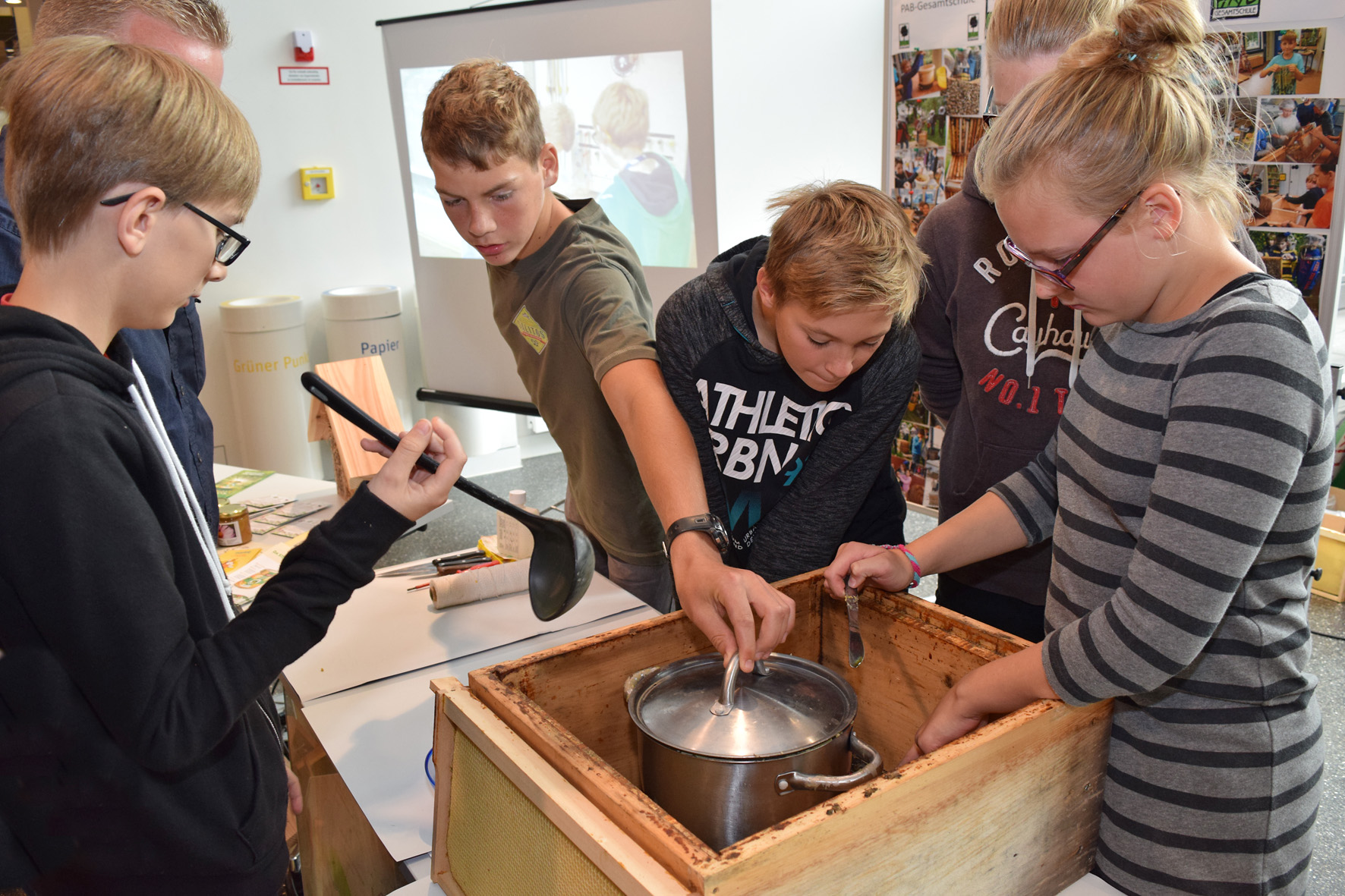 33 Aussteller auf dem „Markt der Möglichkeiten“ stellten ihre Ideen und Angebote zur Nachhaltigkeit vor. „Fair und lecker“ ging es zum Beispiel an der Smoothie-Bar zu, wo reifes Obst geschmackvoll zubereitet wurde und gleichzeitig auch interessante Dinge über die Herkunft des Obstes zu erfahren war und wo die Grundzüge des fairen Handels erklärt wurden. Der Workshop „Die Jeans – die Lieblingshose von uns allen“, regte zum Nach- und Umdenken an: „Wir reisen mit einer Jeans um die Welt, beschäftigen uns mit den Arbeitsbedingungen in der Textilindustrie und reflektieren unser eigenes Konsumverhalten“, hatte es in der Ankündigung geheißen. Am Stand der Bienen AG der Peter-August-Böckstiegel Gesamtschule Werther / Borgholzhausen machten die Schüler auf den wertvollen Beitrag der Insekten zur Erhaltung einer intakten Landwirtschaft und zur Produktion eines unverzichtbaren Nahrungsmittel-Rostoffs aufmerksam.