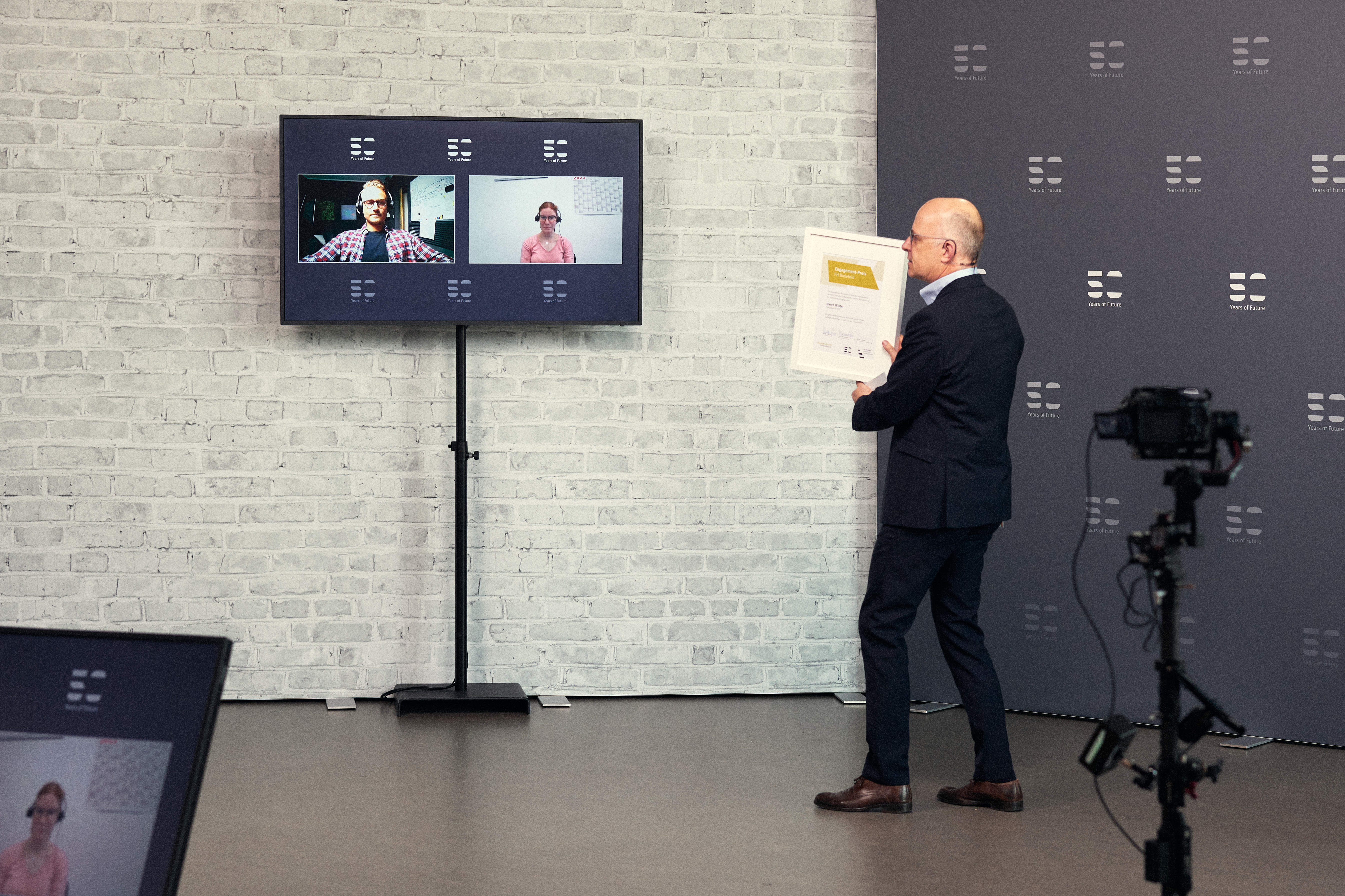 Bielefeld (fhb). Die Verleihung des Engagement-Preises der Fördergesellschaft der Fachhochschule (FH) Bielefeld fand in diesem Jahr erneut digital im Rahmen des Jubiläumsempfangs „50 Years of Future“ statt. Jury-Mitglied Prof. Dr. Michael Stricker gratulierte der 24-jährigen BWL-Studentin Maren Elisabeth Winter und dem 26-jährigen Maschinenbaustudent Jan Philipp Zimmermann: „Ihr vielseitiges Engagement in den unterschiedlichsten Bereichen hat uns alle sehr beeindruckt. Sie mussten sich während der Pandemie zum Teil großen Herausforderungen stellen und haben trotzdem weitergemacht. Es freut mich daher besonders, dass wir den Preis dieses Jahr anlässlich unseres Jubiläums gleich zwei Mal ausloben durften.“ Maren Elisabeth Winter erhielt den Preis für ihren Einsatz im Verein „Freizeit ohne Barrieren e.V.“, Jan Philipp Zimmermann für sein besonders vielseitiges Engagement. Insgesamt bewarben sich dieses Jahr 29 Studierende für den mit 1.000 Euro dotierten Preis.