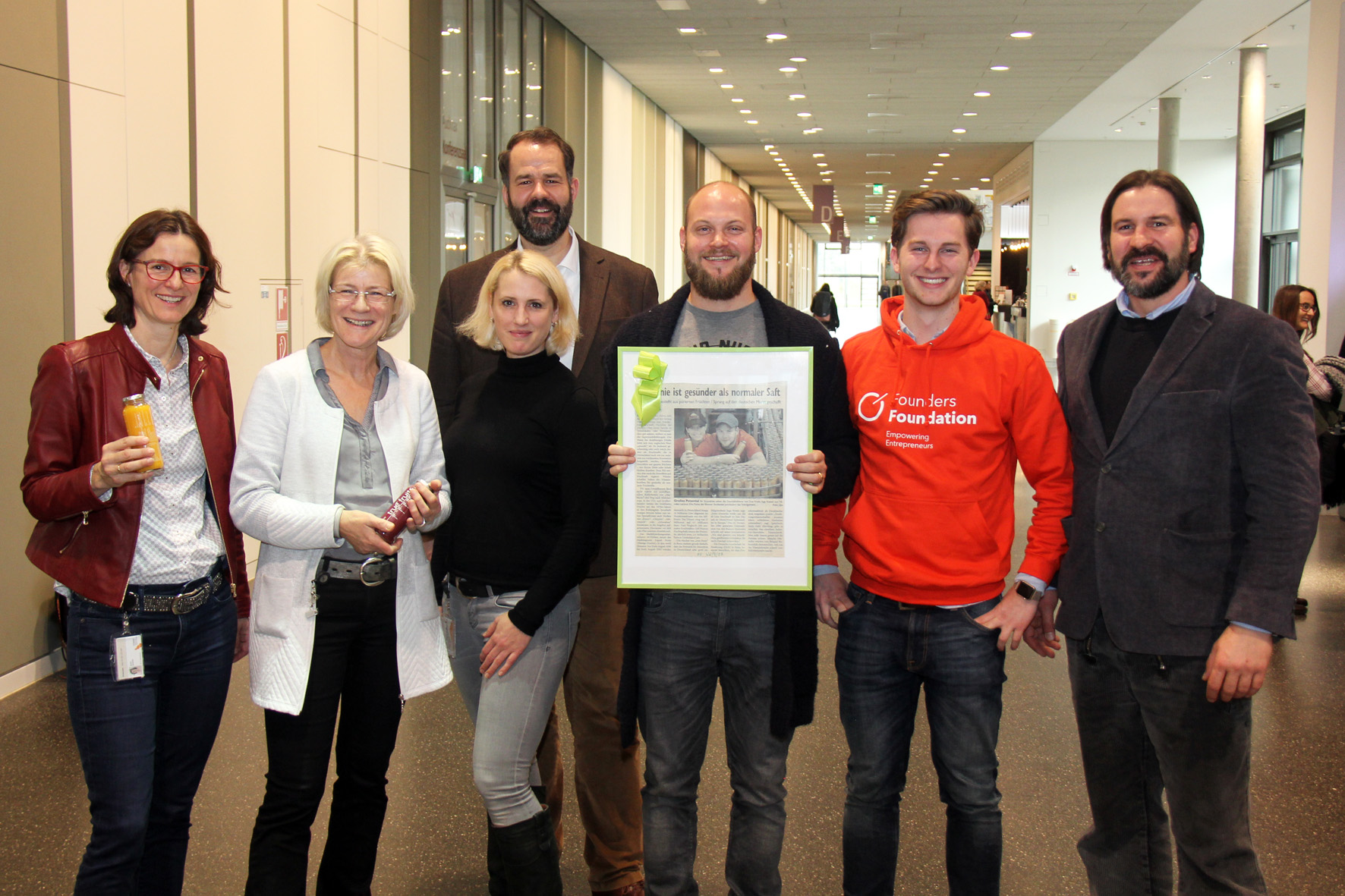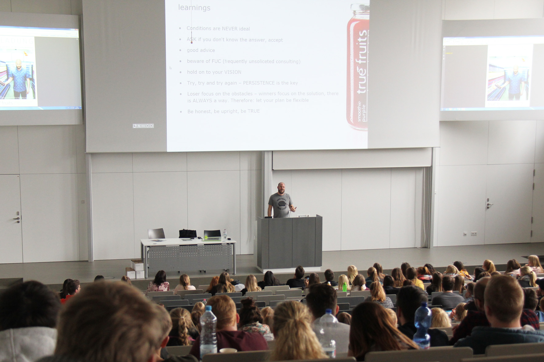 Nach einem 40.000 Euro Umsatz im Gründungsjahr hat „true fruits“ im vergangenen Jahr die 40 Millionen Euro-Grenze geknackt. Das Unternehmen wurde mehrfach ausgezeichnet, hat sein Produktsortiment stetig erweitert und bietet seine Produkte auch über Deutschland hinaus in Österreich und in der Schweiz an. Zudem haben es die Gründer mit geringem Werbebudget zu mittlerweile über 50.000 Facebook-Fans geschafft. Nicolas Lecloux forderte die Studierenden dazu auf, an ihren Visionen und einer Gründung festzuhalten, auch wenn die Bedingungen nie ideal seien.