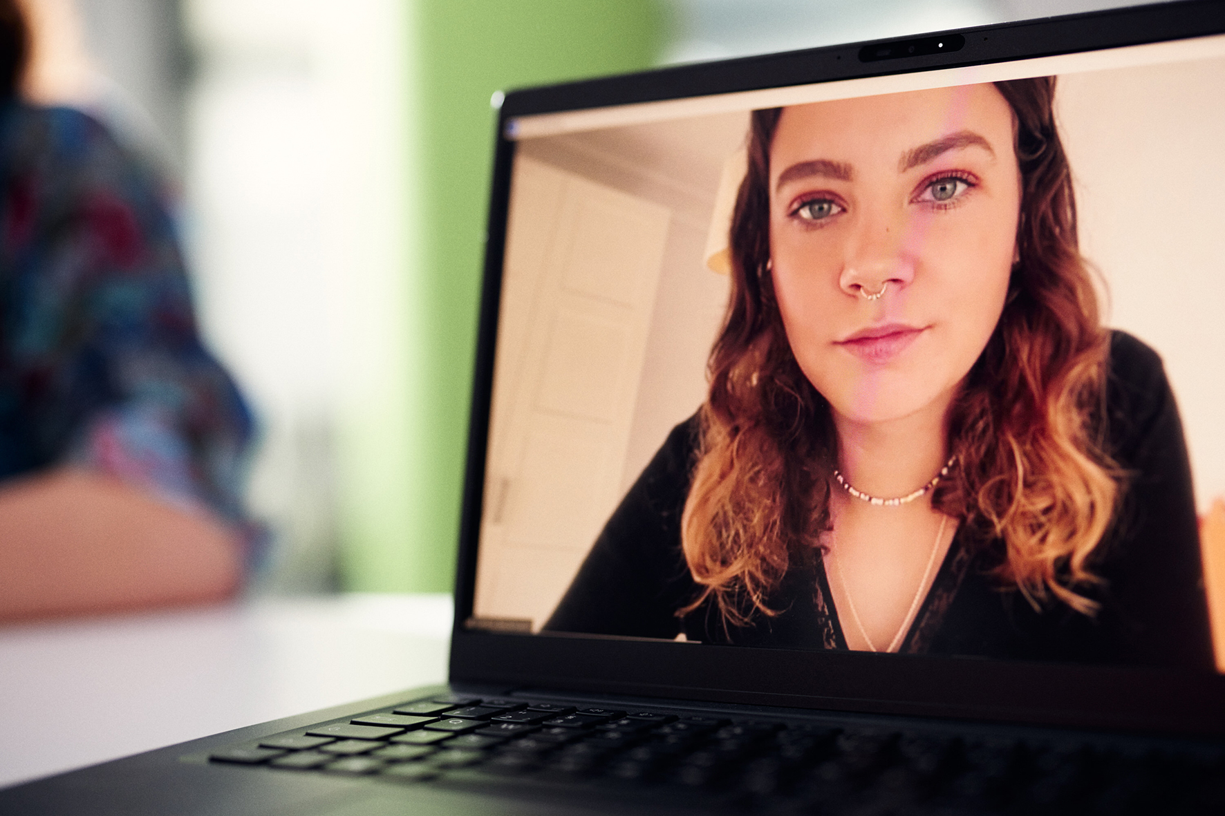 Die Forschende Saskia Beckmann ist der Teamsitzung aus dem Ausland zugeschaltet.
