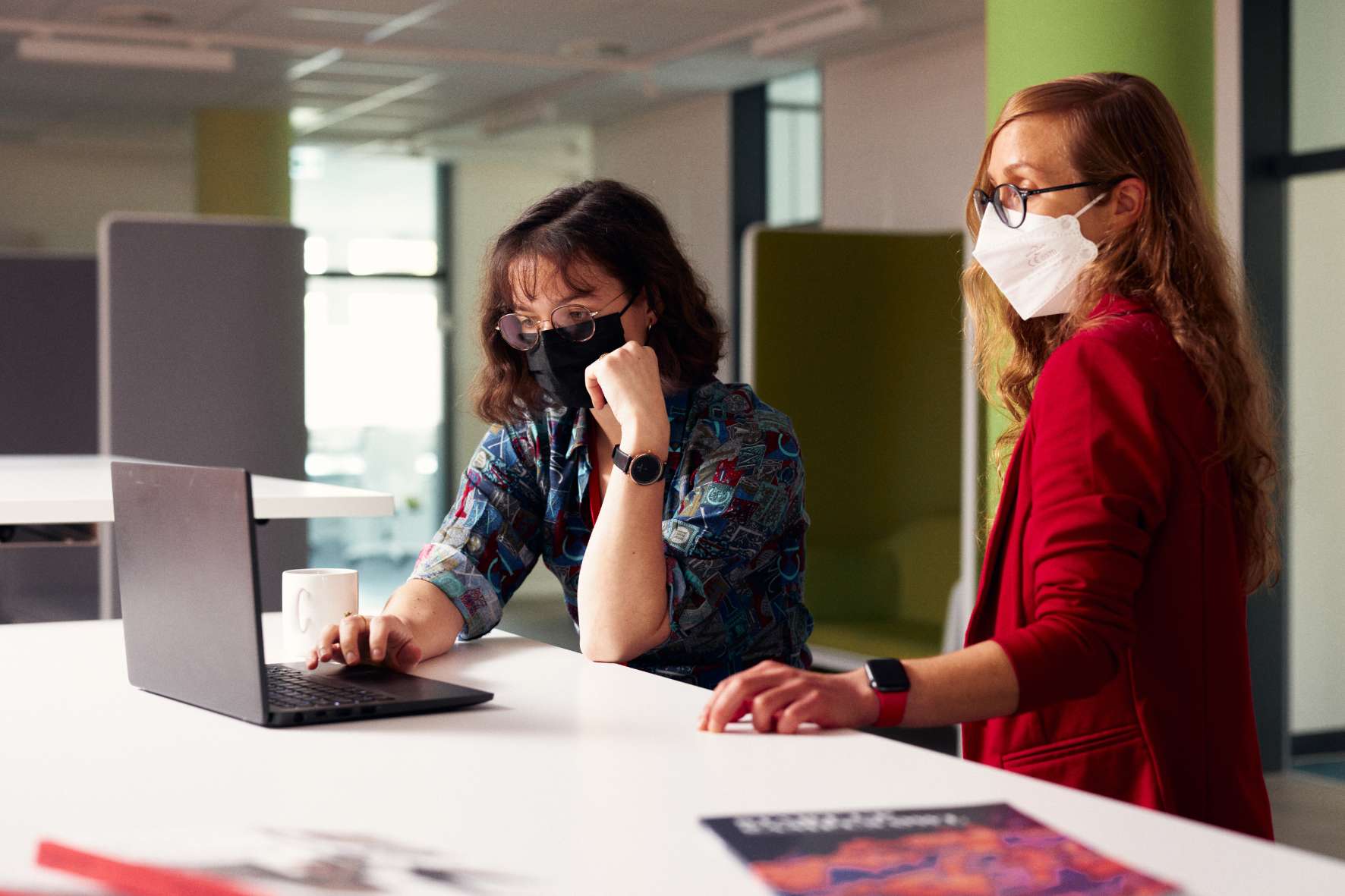 Die COVID-19-Pandemie scheint abzuebben. Nun gibt eine Studie der FH Bielefeld und der Hochschule für Gesundheit Bochum einen aktuellen Überblick über den internationalen Forschungsstand zu den Auswirkungen der Lockdowns auf die psychosoziale Gesundheit junger Menschen. Im Fokus: bildungsbenachteiligte Jugendliche. Die Studie zeigt: psychosoziale Probleme haben zugenommen, Lösungen sind gefragt. Diese erarbeiten die Forschenden im Projekt co*gesund nun gemeinsam mit Fachkräften und Jugendlichen, denen sie so eine Stimme geben möchten.Karen Heid (l). und Prof. Dr. Anna Lena Rademaker bereiten eine Co*gesund-Teamsitzung vor.