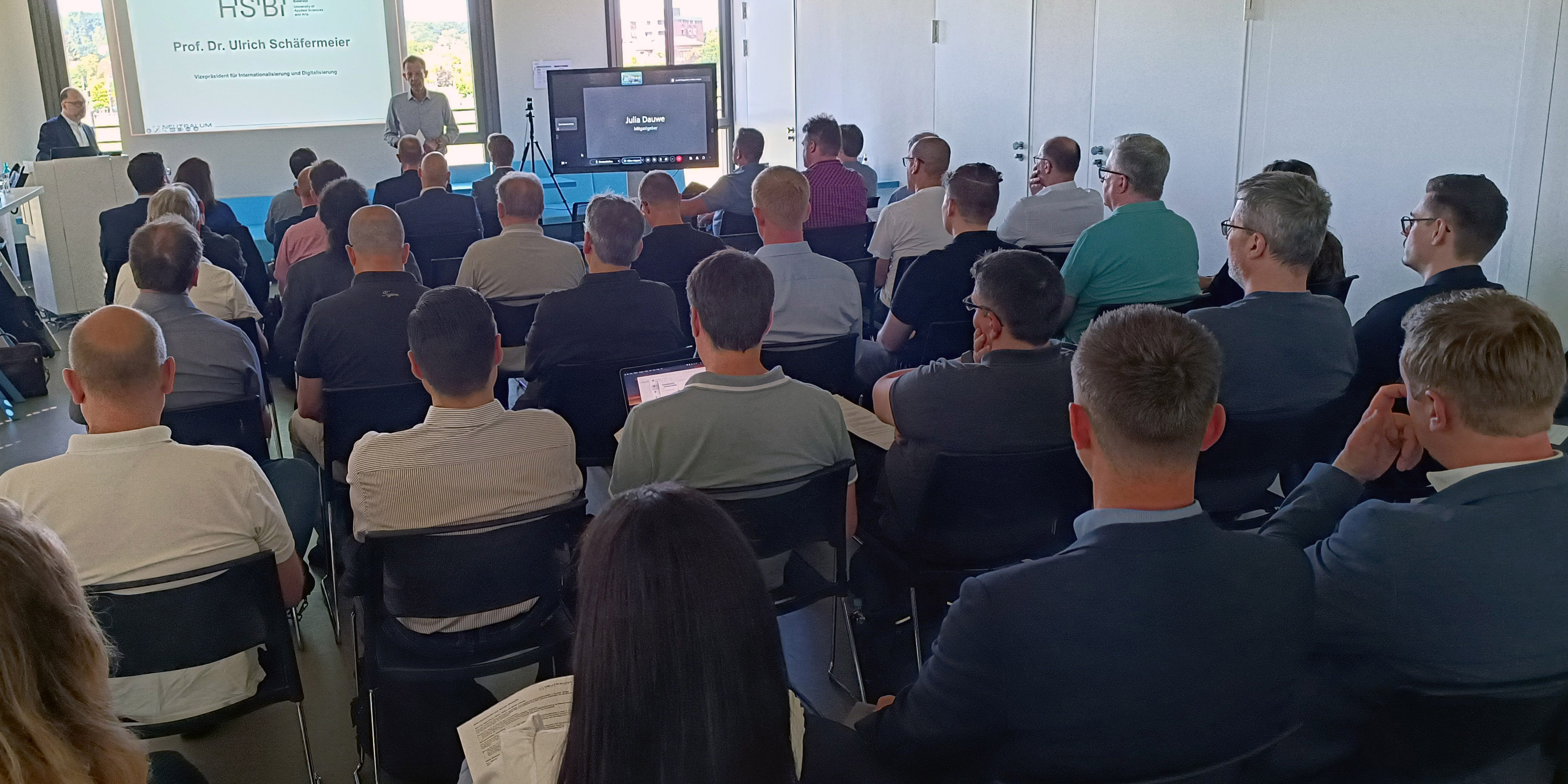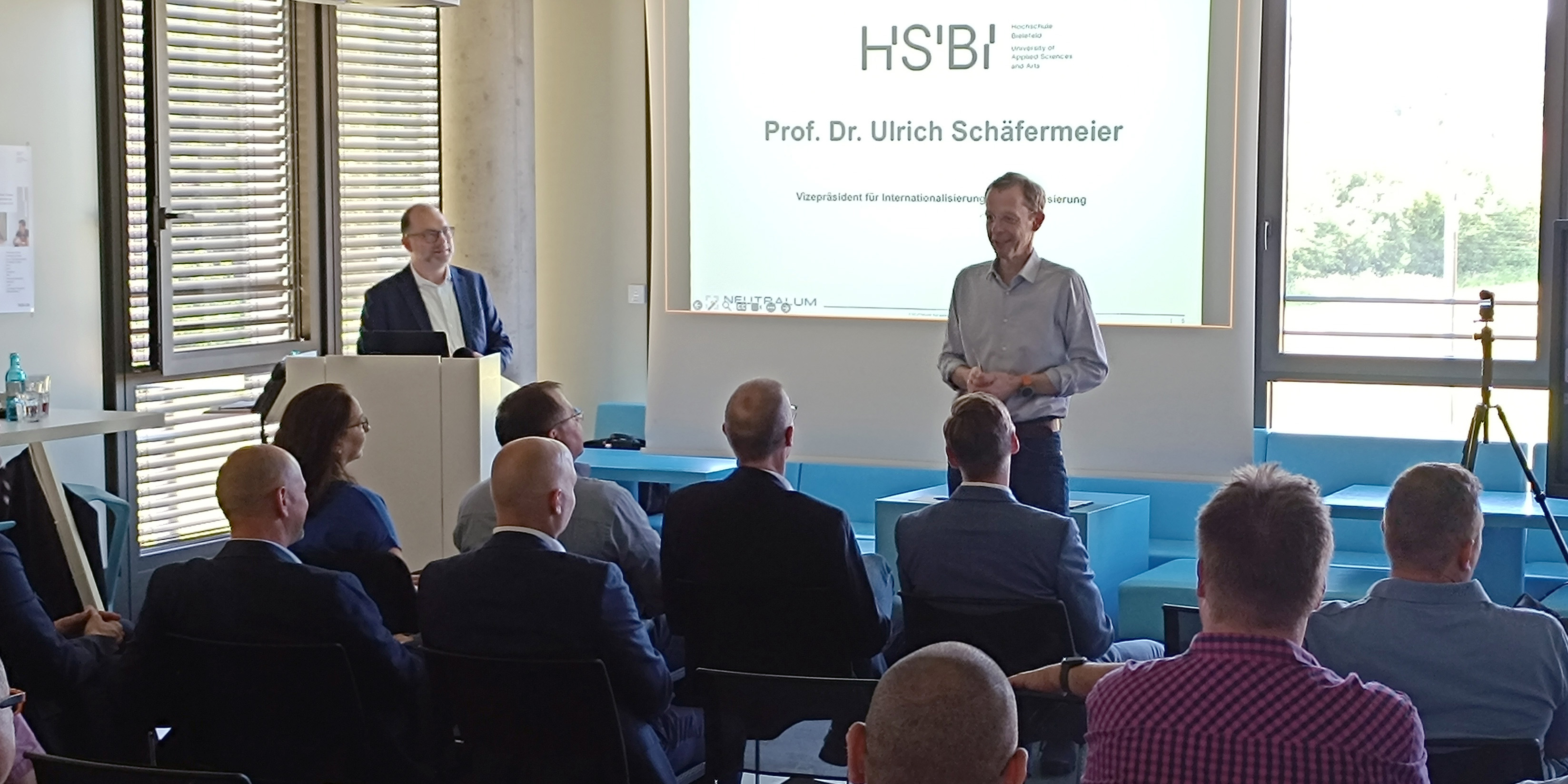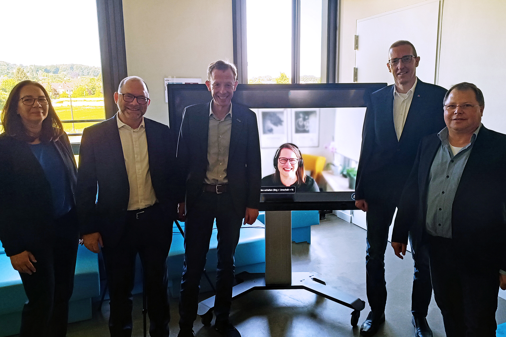 (v.l.) Anja Krämer und Gerrit-Leonhard Stein vom begleitenden IT-Dienstleister Neutralum, Prof. Dr. Ulrich Schäfermeier, HSBI.Vizepräsident für Internationales und Digitalisierung, Julia Dauwe, Mitarbeiterin des Referats für Informationsinfrastrukturen, Informationssicherheit, Digitalisierung in Studium und Lehre am MKW NRW, Lars Köller, Leitung Skim TH OWL und Michael Korff, Leiter der Datenverarbeitungszentrale der HSBI.
