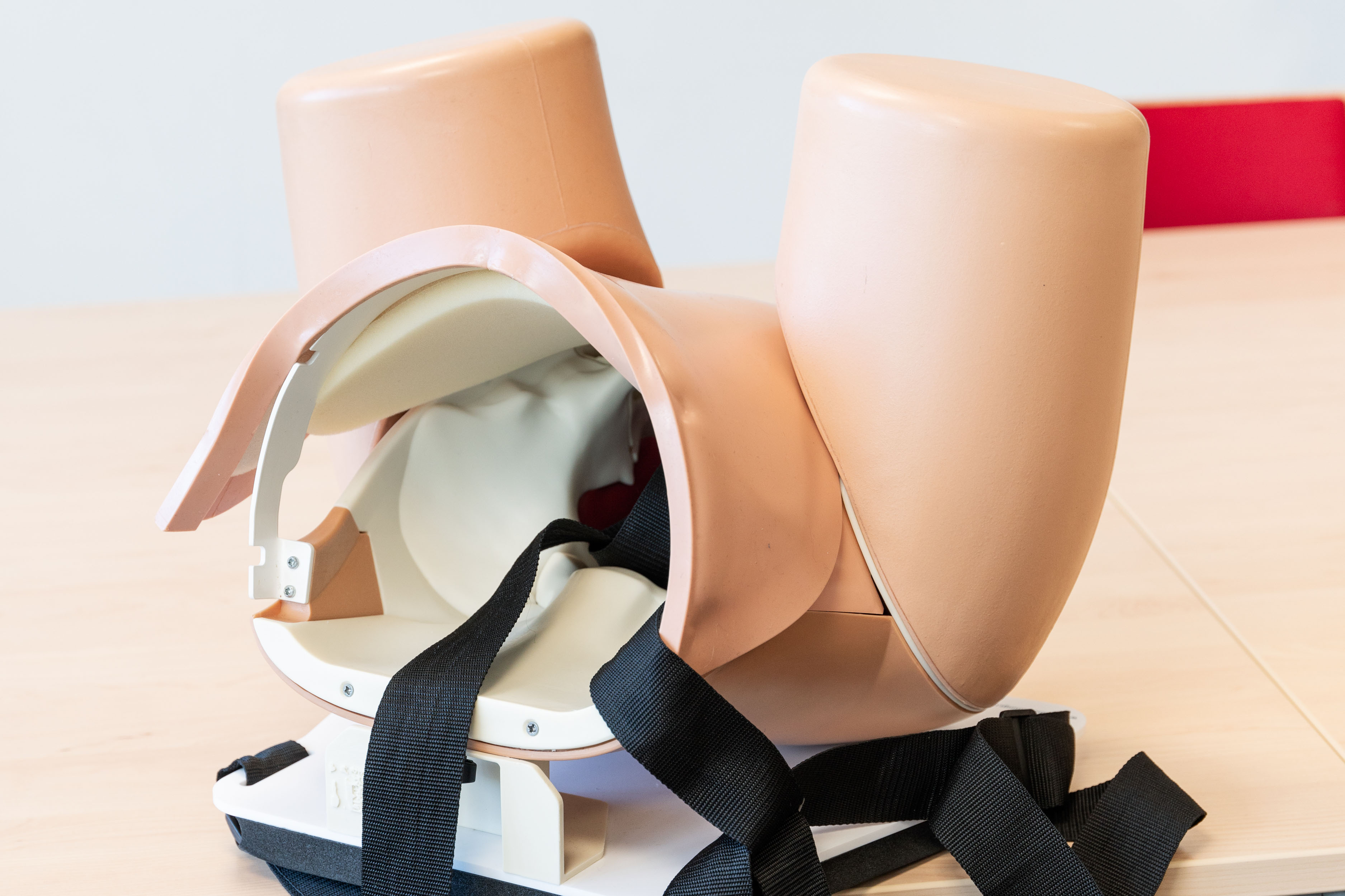 Dennoch ist es beeindruckend, dass die SimMom in der Lage ist, fast alles nachzuspielen, was unter einer Geburt passieren kann. Für unkomplizierte Verläufe, Routine-Untersuchungen, Standardhandgriffe und für die Darstellung von weniger komplexen Notfällen gibt es darüber hinaus noch MamaBirthie. Das ist eigentlich nur ein mobiler Baby-Bauch. Meike Meier legt ihn ihrer Kollegin von der FH an: „Im Unterricht schnallen sich die Auszubildenden MamaBirthie gegenseitig um und agieren dann als Schauspielerinnen. So können sie besonders gut die Kommunikation mit den Gebärenden üben.“ Nicht nur das: Im Bauch steckt auch ein Baby, dessen Lage zu tasten sich genauso gut trainieren lässt wie die für die Einschätzung des Geburtsverlaufs wichtige Weitung des Muttermunds.