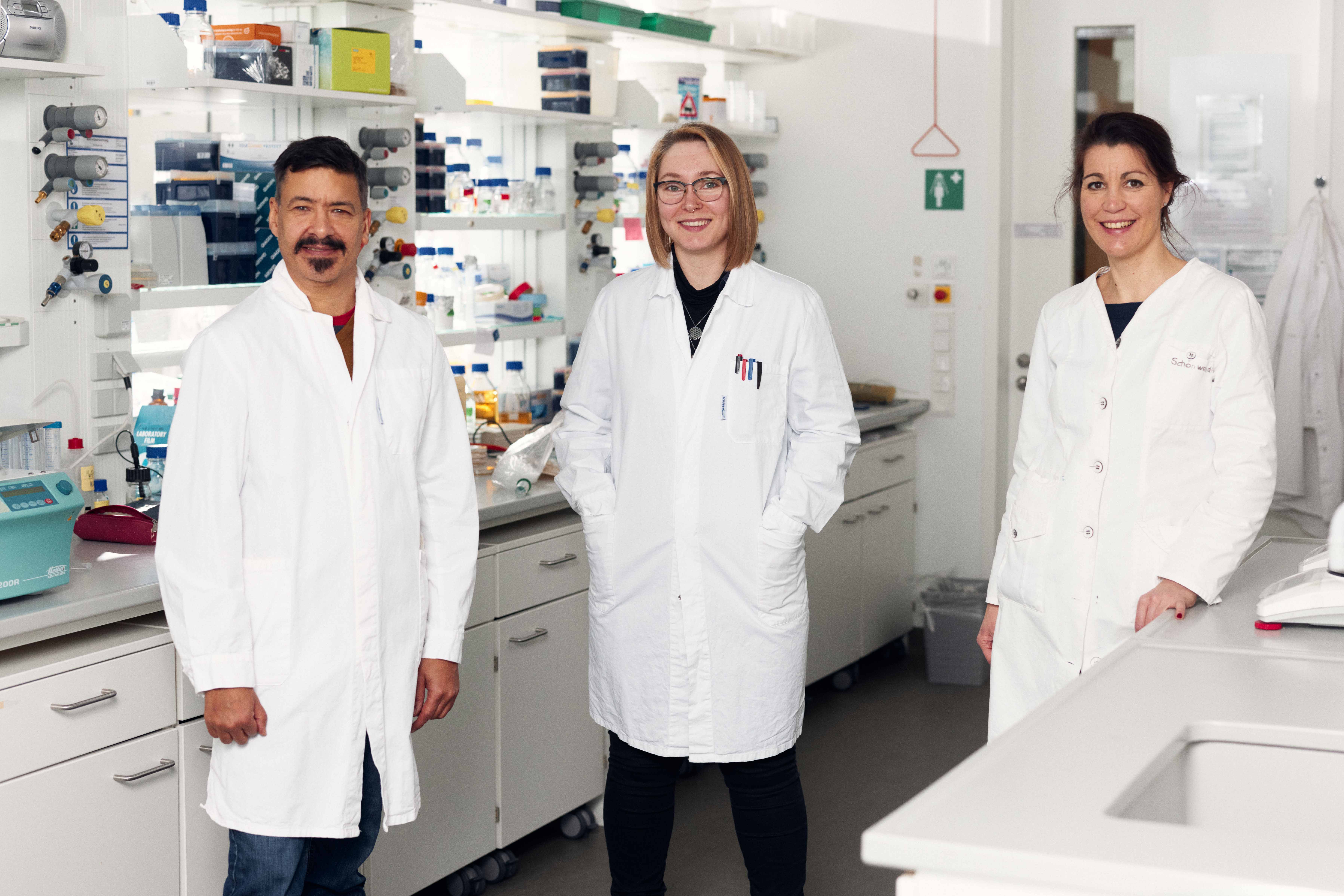 v.l.: Prof. Dr. Anant Patel, Anja Laufkötter und Dr. Désirée Jakobs-Schönwandt von der Arbeitsgruppe „Fermentation and Formulation of Biologicals and Chemicals“ forschen gemeinsam an der Entwicklung von Formulierungen gegen Engerlinge im Boden.