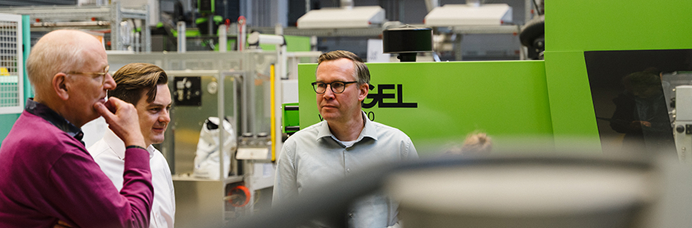 Als junger Forscher wollte er das nicht hinnehmen und entwickelte das Mono-Sandwichverfahren: Vereinfacht gesagt werden hierbei die beiden unabhängige Aggregate so miteinander verbunden, dass die beiden Komponenten ohne Unterbrechung direkt hintereinander eingespritzt werden können. „Die Pause durch das Umschalten zwischen den Aggregaten fällt weg, und damit verschwindet auch die kleine Unebenheit auf dem Bauteil“, beschreibt Jaroschek den Vorteil des Verfahrens, das er 1989 patentieren ließ. Inzwischen ist das Patent abgelaufen, die Forschung zu Sandwich-Verfahren ist aber überschaubar geblieben. Dabei ergeben sich vor allem durch die gesetzlichen Vorgaben für den Einsatz von Rezyklaten viele neue Forschungsfragen: „Welche Rezyklate eignen sich wofür, wie hoch kann der Anteil an recyceltem Material sein, ohne Abstriche an die Qualität, wie lassen sich Rezyklate am besten mit Neumaterial kombinieren?“, nennt Martin Schäfers Beispiele, die mit Hilfe der 2-K-Spritzgießmaschine künftig untersucht werden könnten. Der Professor sieht hier großes Potential für die Bielefelder Forschenden: Neben der eigenen Arbeitsgruppe kommen hier vor allem die Technologiescouts des Transferprojekt InCamS@BI infrage. Das interdisziplinäre Team aus Forschenden von HSBI und Uni Bielefeld beschäftigt sich neben der Schaffung neuer Transferstrukturen auch mit der Integration von Kunststoffen in die Circular Economy. Hier könnten die erweiterten Möglichkeiten der Maschine helfen, sich neuen Anfragen aus der Unternehmenspraxis zuzuwenden.