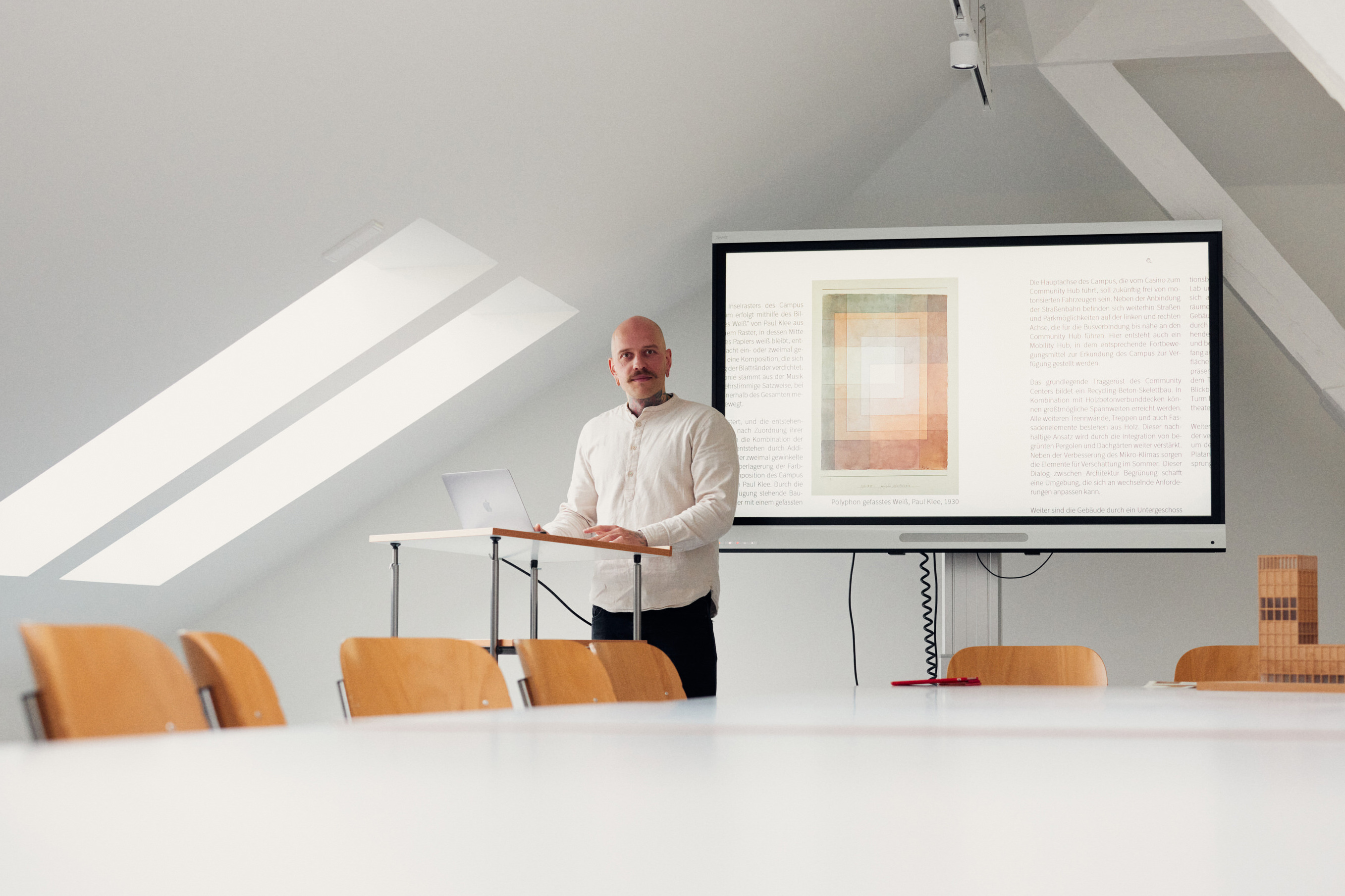 Für die Abbildungen in seiner textlichen Ausarbeitung griff der angehende Architekt noch einmal in die Trickkiste der Informatiker: „KI. Ich habe die literarischen Beschreibungen der Räume in eine entsprechend programmierte Software eingegeben und so Illustrationen erhalten.“ Schließlich rasterte Kresse das Gelände und wies den entstandenen Parzellen je nach zugeordneter Disziplin unterschiedliche Farben zu, als Grundlage für die Übertragung in den architektonischen Entwurf. Denn dafür hatte er längst eine weitere Anregung gefunden, diesmal in der bildenden Kunst: Paul Klees Werk „Polyphon gefasstes Weiß“ (1930), eine abstrakte Arbeit mit verschiedenen, einander überlagernden Farbschichten, gruppiert um ein weißes Feld im Zentrum. „Durch das Zusammenbringen der unterschiedlichen Farben entsteht Neues, ähnlich wie bei der Interdisziplinarität“, so Kresse.