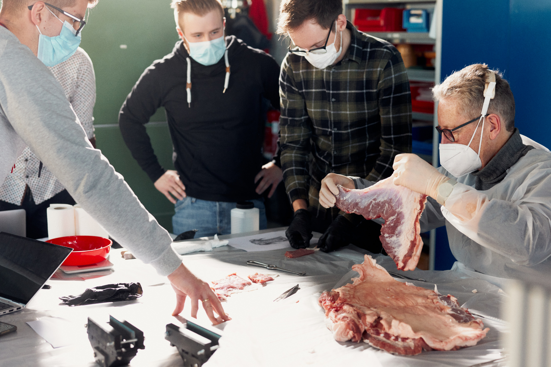 Nach wochenlangen theoretischen Vorbereitungen ist endlich der Versuchstag gekommen: Auf dem großen Tisch in der Maschinenhalle des Campus Minden liegt das Fleisch auf einer weißen Abdeckfolie. Dr. Jörg Höer, der zu dem Experiment extra nach Minden gereist ist, präpariert das Gewebe mit dem Skalpell in zuvor festgelegte Teile. Mal mit, mal ohne Faszien, mal ein Längsmuskel, mal ein Quermuskel.