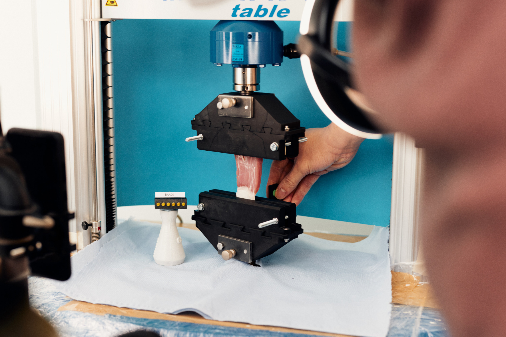 Als das erste Fleischstück in die mit hunderten kleinen Nadeln bestückten Klemmbacken eingelegt und in die Zugprüfmaschine eingesetzt wird, ist die Spannung im Raum greifbar. Alle Beteiligten sind überrascht, wie lange das Gewebe bis zum Reißen standhalten konnte. Einige Studierende hatten im Vorfeld sogar Wetten auf das Messergebnis abgeschlossen.