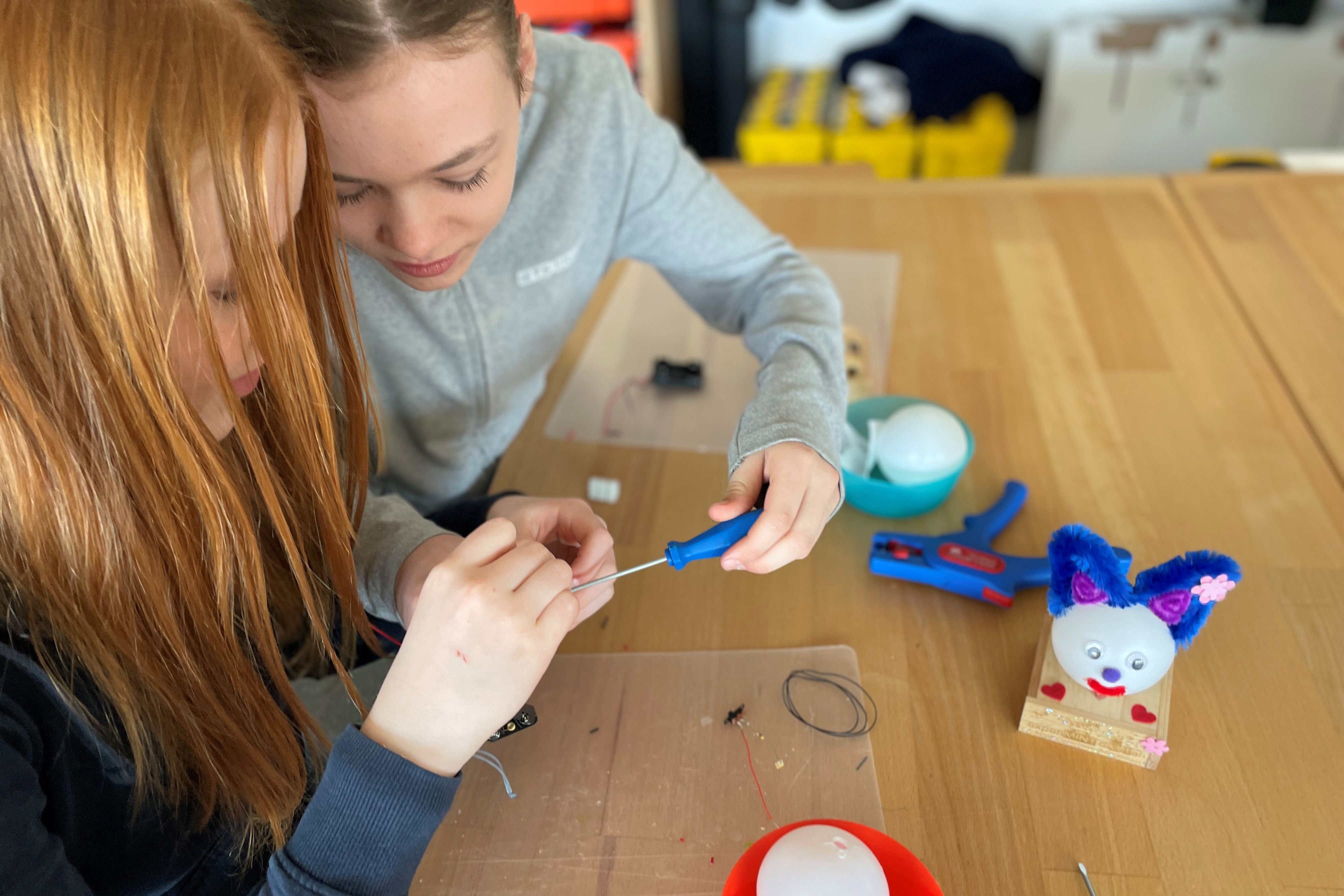 Für ihre eigenen Lampen haben diese Mädchen am Campus Gütersloh einen Stromkreis gebaut, Holz zugeschnitten und gestaltet und gelernt, warum eine LED überhaupt leuchtet.