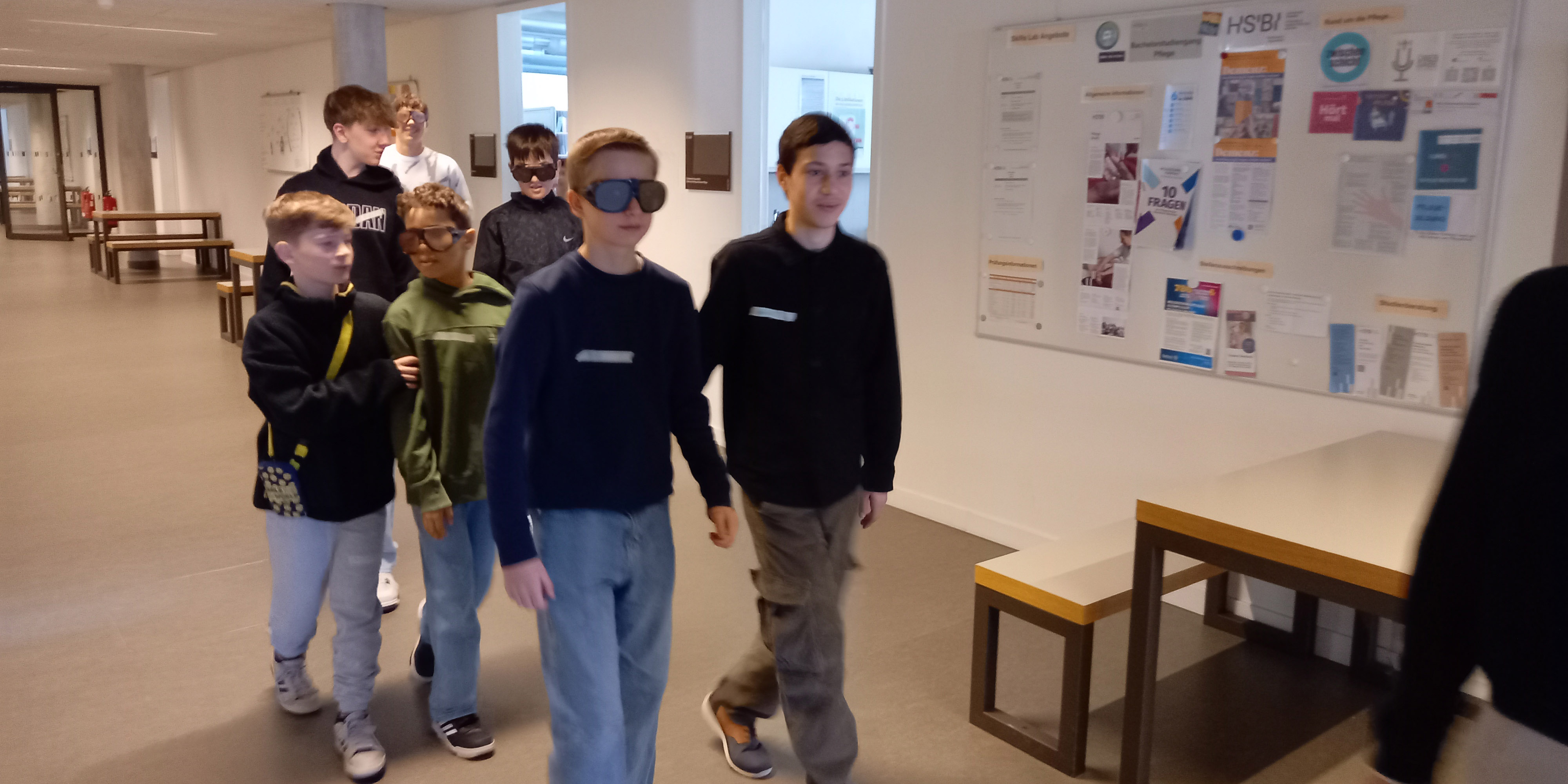 Wie sich Alt-Sein anfühlt und wie die Arbeitswelt eines Pflegefachmanns aussehen kann, konnten zehn Schüler im Skills Lab Pflege erleben. Ihnen wurden allgemeine Informationen zum Bachelorstudiengang Pflege an der HSBI und dem späteren Berufsalltag vermittelt. Zusätzlich konnten die Jungen selbst einiges ausprobieren: Mit speziellen Brillen, die altersbedingte oder durch Krankheit verursachte Sehschwäche simulieren, wagten sie gemeinsam einen Rundgang durch das HSBI-Gebäude. Außerdem simulierten sie im Skills Lab einige Notsituationen und den richtigen Umgang damit. Sie lernten zum Beispiel eine Reanimation an Übungspuppen. (nbe)